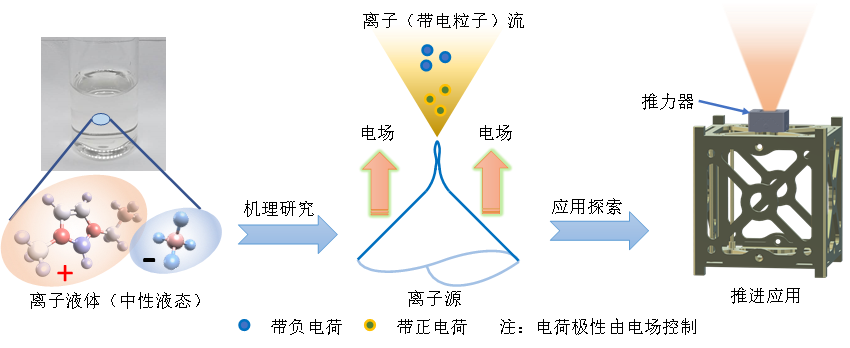 离子液体是一种由有机阳离子和有机或无机阴离子组成的固液转变温度(熔点或玻璃化转变温度)低于100℃的低温熔盐,具有真空不挥发,宽液态范围、绿色无毒等众多空间推进应用中理想的性质。通过合理控制外加电场可以将离子液体直接从液相转换成高速带电粒子(离子、离子簇、带电液滴)并产生推力,从而避免了传统气相电离推进方式中电子自由程对推力器尺寸的限制,以及碰撞电离带来的能量损失和复杂推力器结构。因此,离子液体电推进具有全面突出的潜在性能优势,是微纳卫星极具吸引力的动力解决方案。离子液体电推力器对结构部件的极致简化要求是工程应用的理想状态,但在其“简单”外表下的复杂机理问题,是研究人员必须深入探索理解以实现对更简单结构有效控制的基石,也是其背后更为复杂且极具魅力的科学本质。本项目在taptap点点体育博士论文创新基金资助下,以空间推进应用的重要需求为牵引,深入开展离子液体电致发射机理研究,探索离子液体电推进应用。