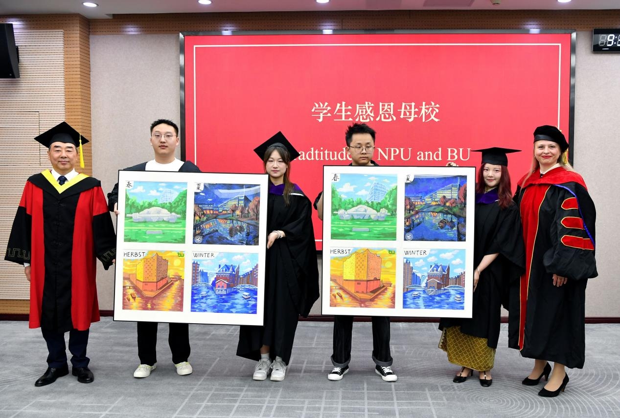 随后,毕业生代表卞辰晨深情回顾了求学时光,感恩母校与导师的培养。研究生院常务副院长朱继宏、国际合作处处长孔杰、品牌应用科学大学校国际合作学术总监王斯梵共同为优秀毕业生颁发荣誉证书。毕业生向两校赠予他们手绘的礼物,用春夏秋冬描述自己在西工大和品牌应用科学大学的求学时光。岳晓奎、尤卡·莱蒙-卡利桑接受了赠予。