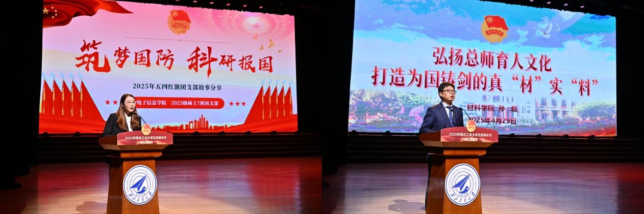 2025年五四红旗团支部代表、电子信息学院研究生230807班团支部张海蕊以“筑梦国防、科研报国”为题,通过讲述团支部在信息通讯领域攻坚克难、把论文写在祖国大地上的故事,充分展现团队成员为国铸剑的硬核担当。五四红旗团委代表、材料学院团委书记孙磊以“弘扬‘总师育人文化’,打造为国铸剑的真‘材’实‘料’”为题,通过讲述学院团委在思想引领、组织建设、创新创业等方面工作实效,号召大家以更饱满的热情、更扎实的工作为学校事业发展贡献力量。