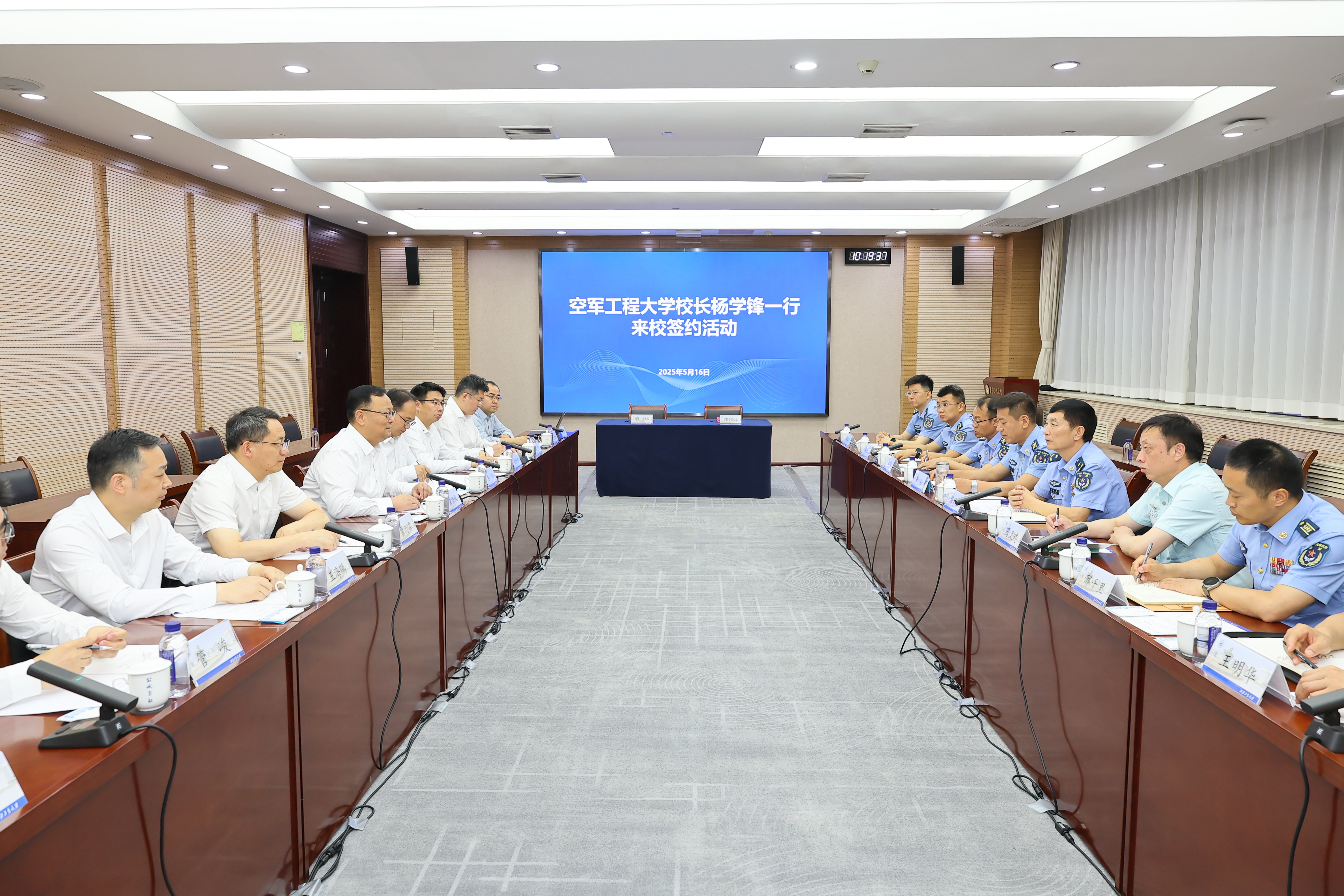 宋保维代表学校对杨学锋一行表示欢迎,并简要介绍了学校的历史沿革与办学特色。他说,空军工程大学是我军高素质人才培养的重要基地、空天作战理论和武器装备技术研发的高地。两校建立了密切合作和深厚友谊,本次合作框架协议的签署标志着双方合作进入新的阶段、合作关系更加亲密。希望双方发挥各自优势,通过人才培养、师资培养、科学研究、共享资源等多种形式,共同在科研项目合作谋划、平台建设合作谋划、奖项申报合作谋划三个方面展开进一步的有组织合作,探索军地高校协调创新发展新模式,共同为我国航空事业发展建设作出新的更大贡献。