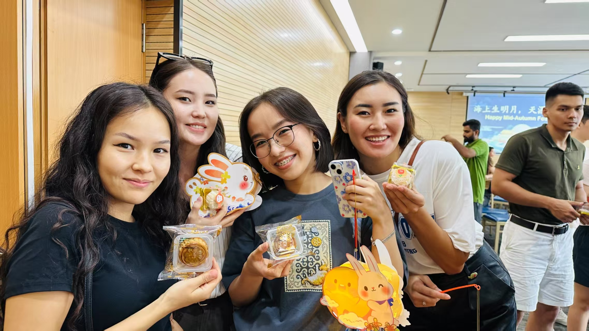 迪丽娜孜(左三)与哈萨克斯坦留学生们一起欢度中秋节