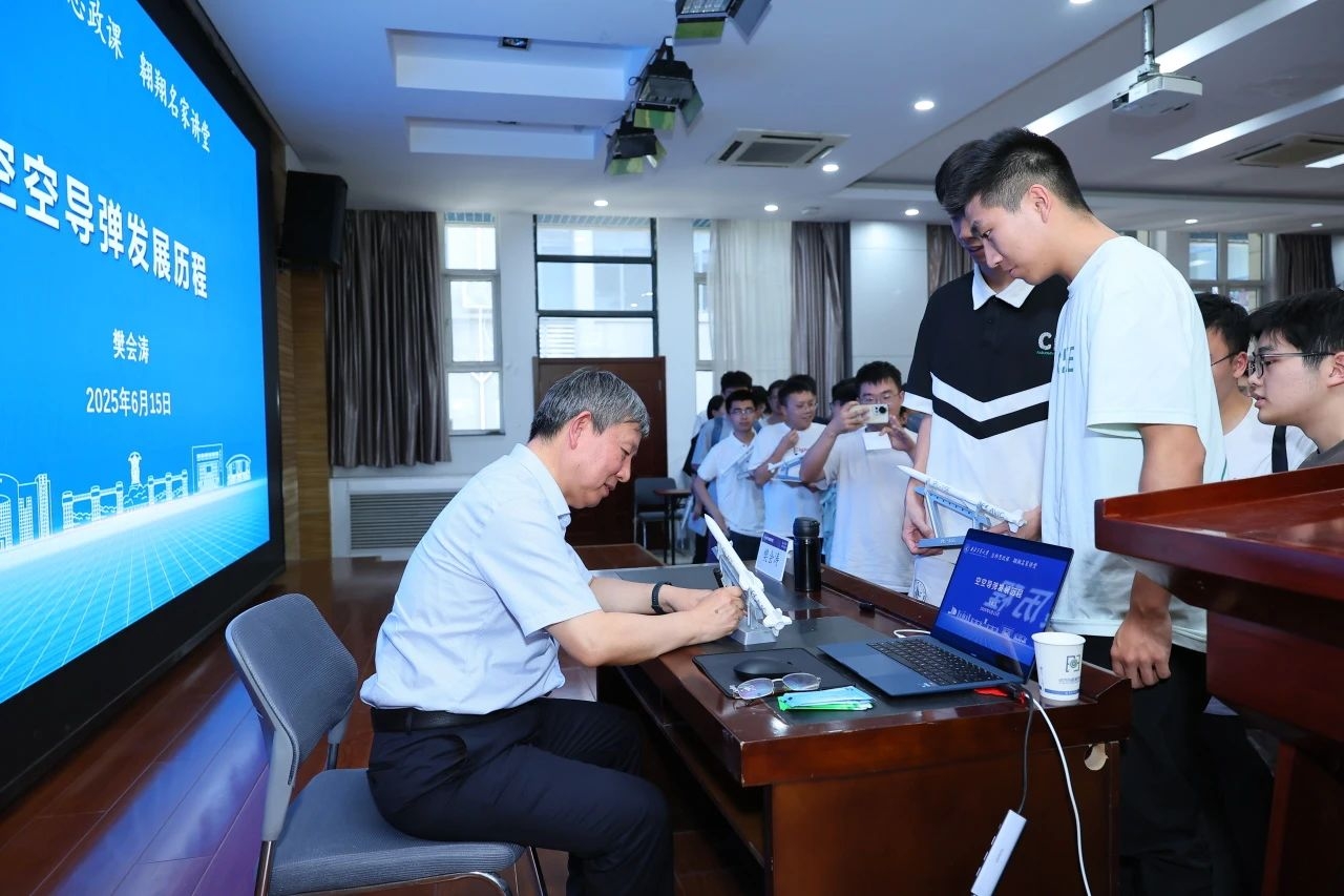 同学们围绕科技创新思维、职业生涯发展规划、“总师型”人才特质等踊跃提问,樊会涛结合自身丰富的型号研制经验,给予了详尽解答,并着重阐述了知识学习与持续创新的核心价值。交流会后,樊会涛向学生代表赠送了若干册钤有个人印章的《空空导弹作战概论》。这份珍贵的礼物寄托着他对青年学子投身国防科技事业的殷切期望与勉励。