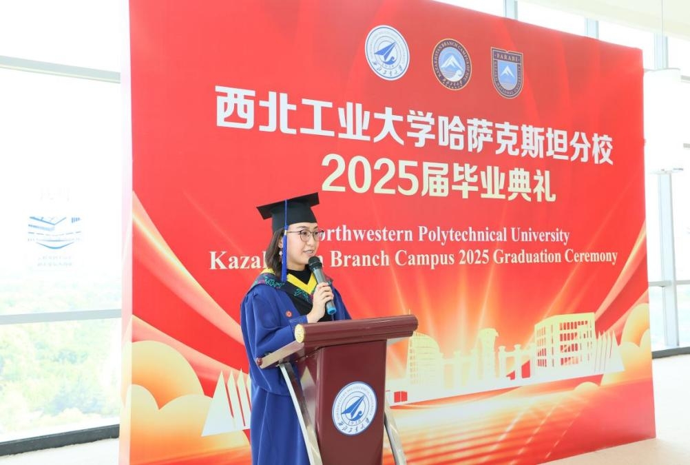 毕业生代表迪丽娜兹深情回顾求学岁月,她向导师及全体任课教师致以诚挚谢意,并为在哈分校的成长历程深感自豪。她表示,作为首届毕业生,同学们都深知肩负的特殊使命,并庄严承诺:“我们是中哈文化的使者,无论未来走向何方,我们都将继续传递友谊、促进交流,让这座跨越山海的桥梁更加坚固。”