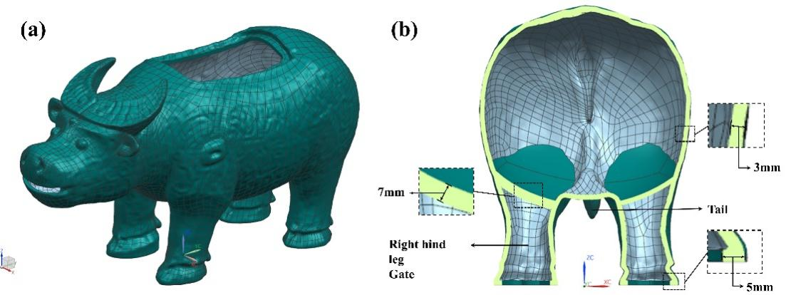 牛尊凝固过程的观察,揭示了商代晚期铸造工艺的多项成就,如浇、冒口设计与金属垫片(内冷铁)的应用。当时工匠对浇冒口的选择,做到了今天材料科学视角下的最优解,展现了工匠的高超智慧。团队在模拟时,曾经尝试将之前根据考古观察得出的浇冒口进行互换,结果发现器物的整体缺陷提高了一倍不止。此外,牛尊的整体造型严格遵守了壁厚均等设计原则。除了腹腔之外,牛尊的角与四足均为中空,整体约保持了3毫米的壁厚,仅在牛蹄接触地面的部位厚度为5毫米,为整件器物提供了很好的支撑功能。值得一提的是,牛尊的右后足与腹腔连接部位壁厚略厚,达到了7毫米左右,这并非设计失误,而是工匠为适应浇口功能而进行的巧妙调整,体现了高超的技术创造力。这样的器物设计,使得器物的充型的过程中铜液流畅,极大的减少了铸造缺陷的产生。