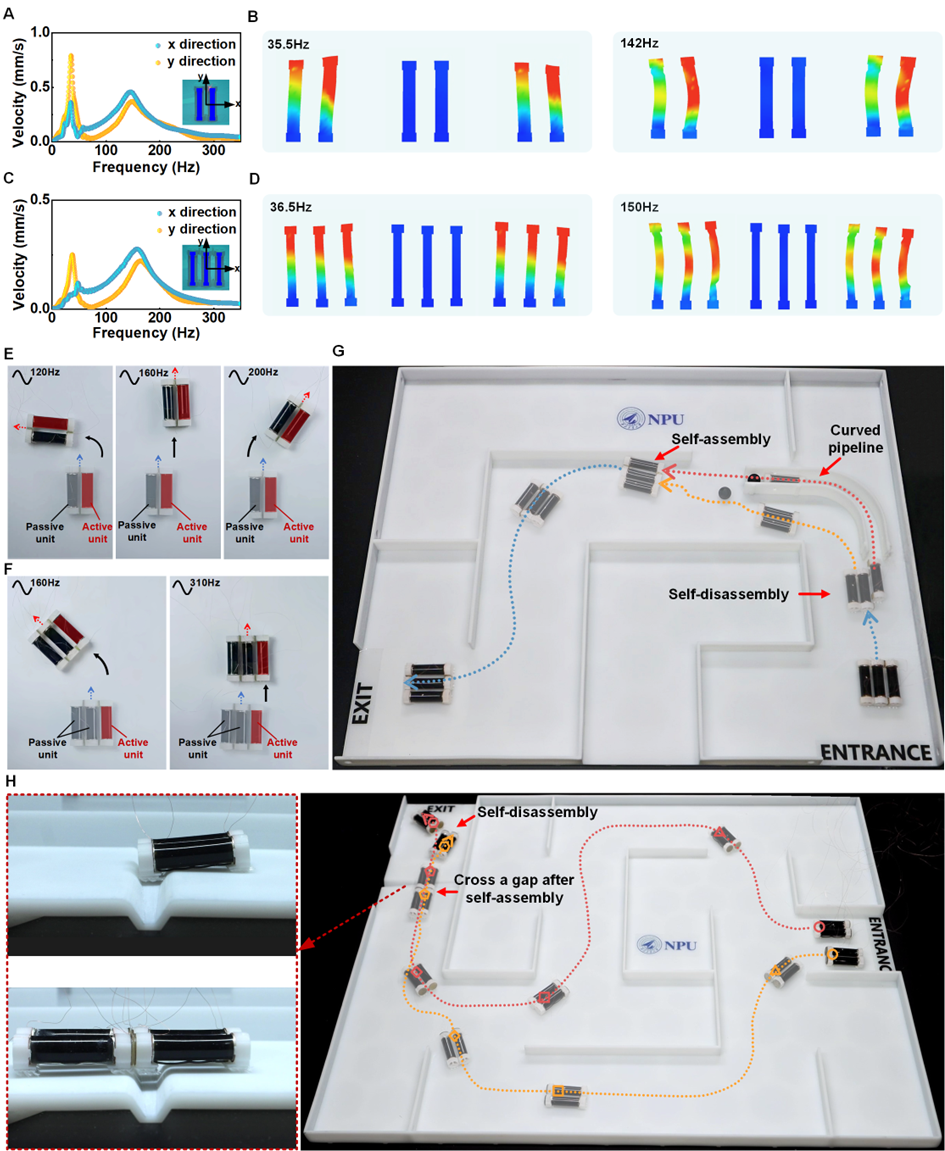 图2 集群机器人的运动及自重构。(A-F) 集群机器人的动力学响应和运动;(G-H)复杂空间中机器人的自重构