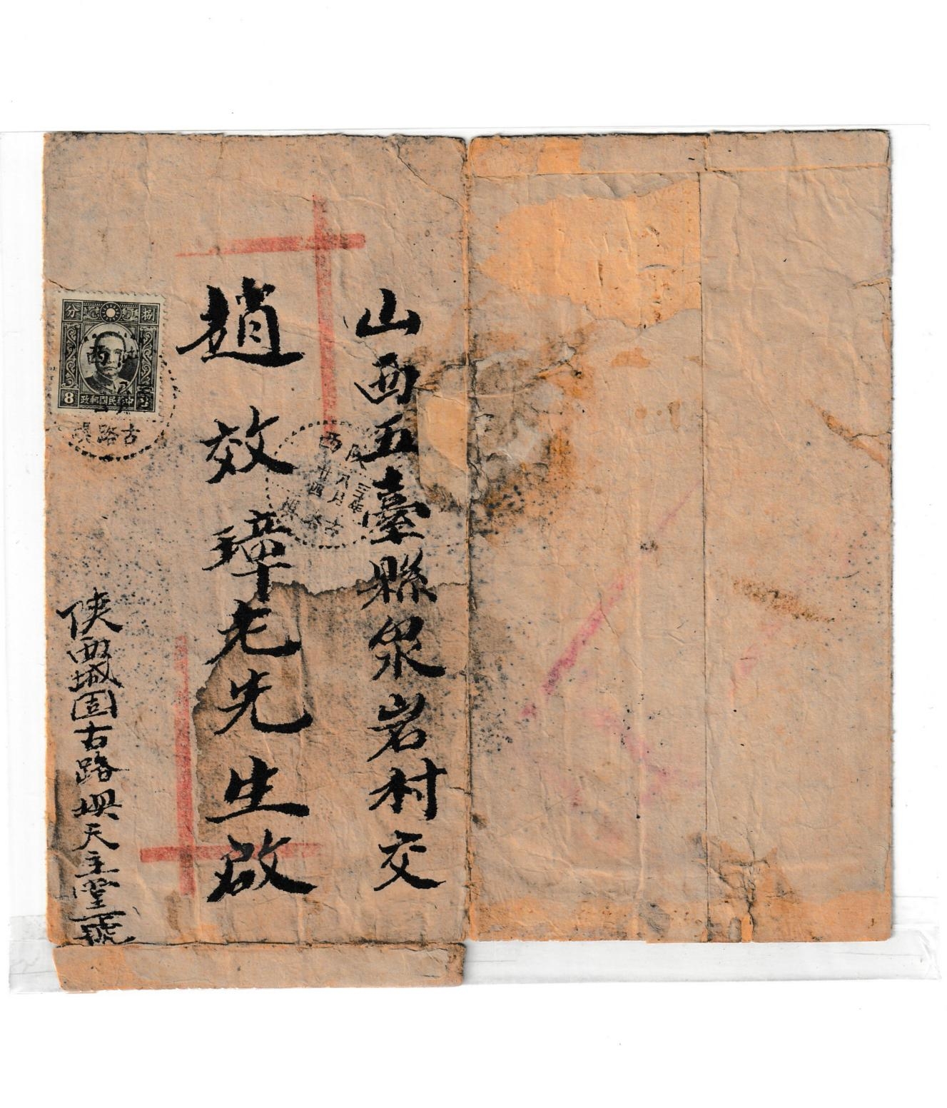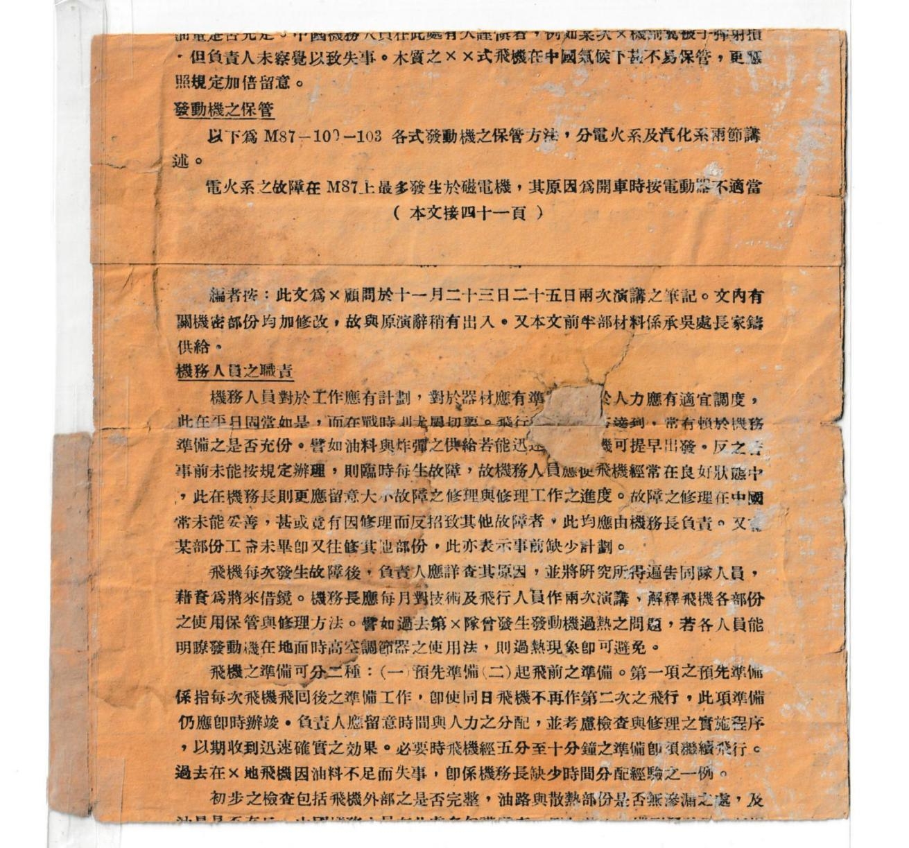 第一件藏品为1941年8月24日古路坝寄山西五台县泉岩村国内平信,贴平信邮资8分孙中山像邮票一枚,寄出地址落款为“陕西城固古路坝天主堂一号”。天主堂是古路坝标志型建筑。该封的另一特点为,将信封剖开可清楚地展现,这是寄信人用航空机电系的旧教材自制的信封,教材页面包括“M87-100 各式发动机保管方法”和“机务人员之职责”,真实反映了当时坚守古路坝办学的国立西北工学院条件的艰苦和师生节俭的生活习惯。