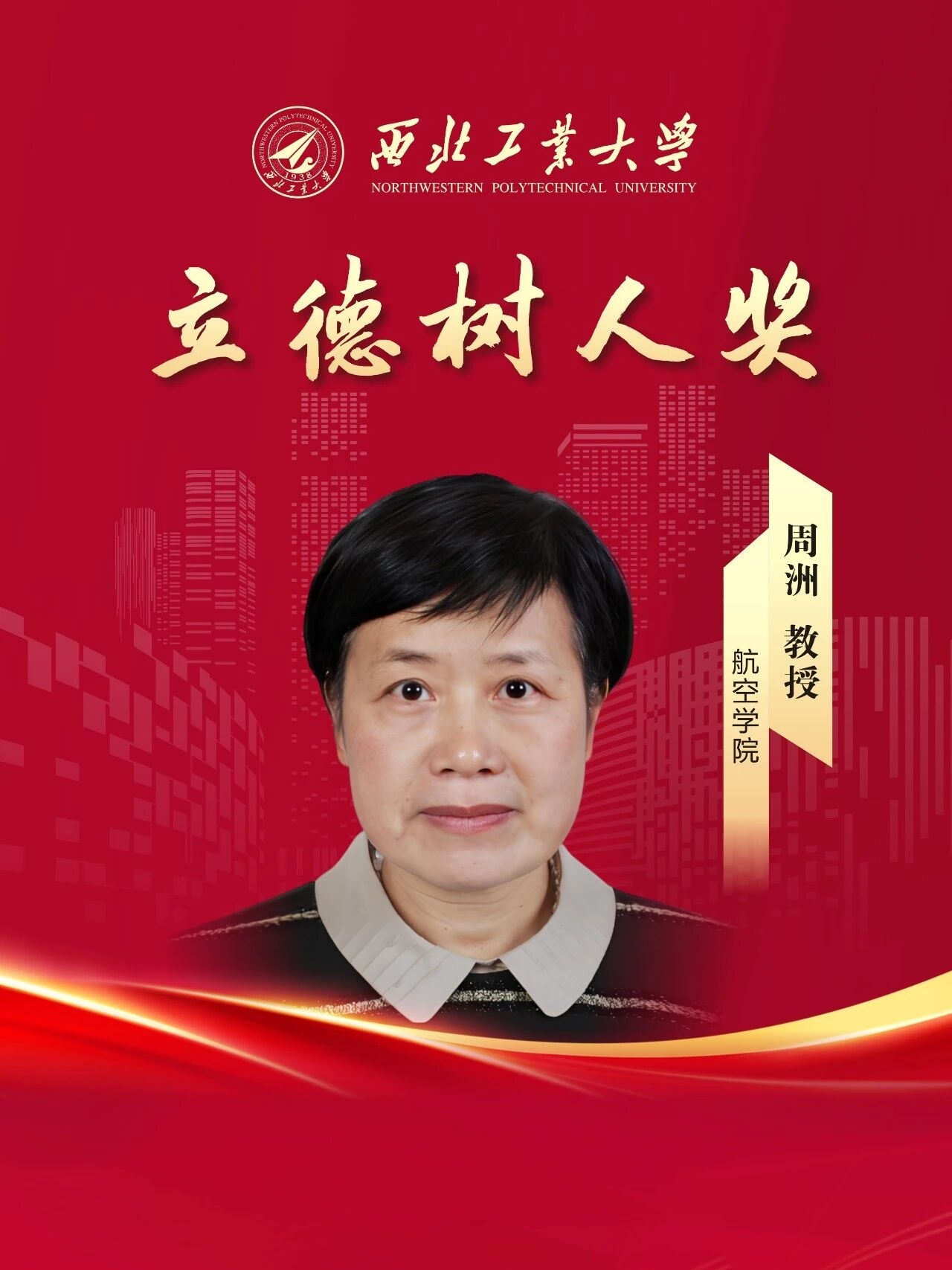 周洲,航空学院教授、博士生导师,从教33年。无人机领域专家,曾任国防重点实验室主任及研究所副总工程师。获中国青年科技奖,国家级领军人才,享受国务院政府特殊津贴。在教育教学方面,打造了“最后一堂课”、“魅影开讲啦”等品牌思政活动,以高原科考、重走长征路深化爱国主义教育,获评陕西省教书育人楷模。在人才培养方面,培养硕、博士研究生166人,毕业生中百余人成长为科研骨干及型号总师。在科学研究方面,带领团队攻克高空长航时、隐身无人机等多项国内首型装备技术,主持国家级科研项目20余项,获国家科技进步一等奖2项、省部级科技奖10项,授权发明专利35项,发表论文401篇。