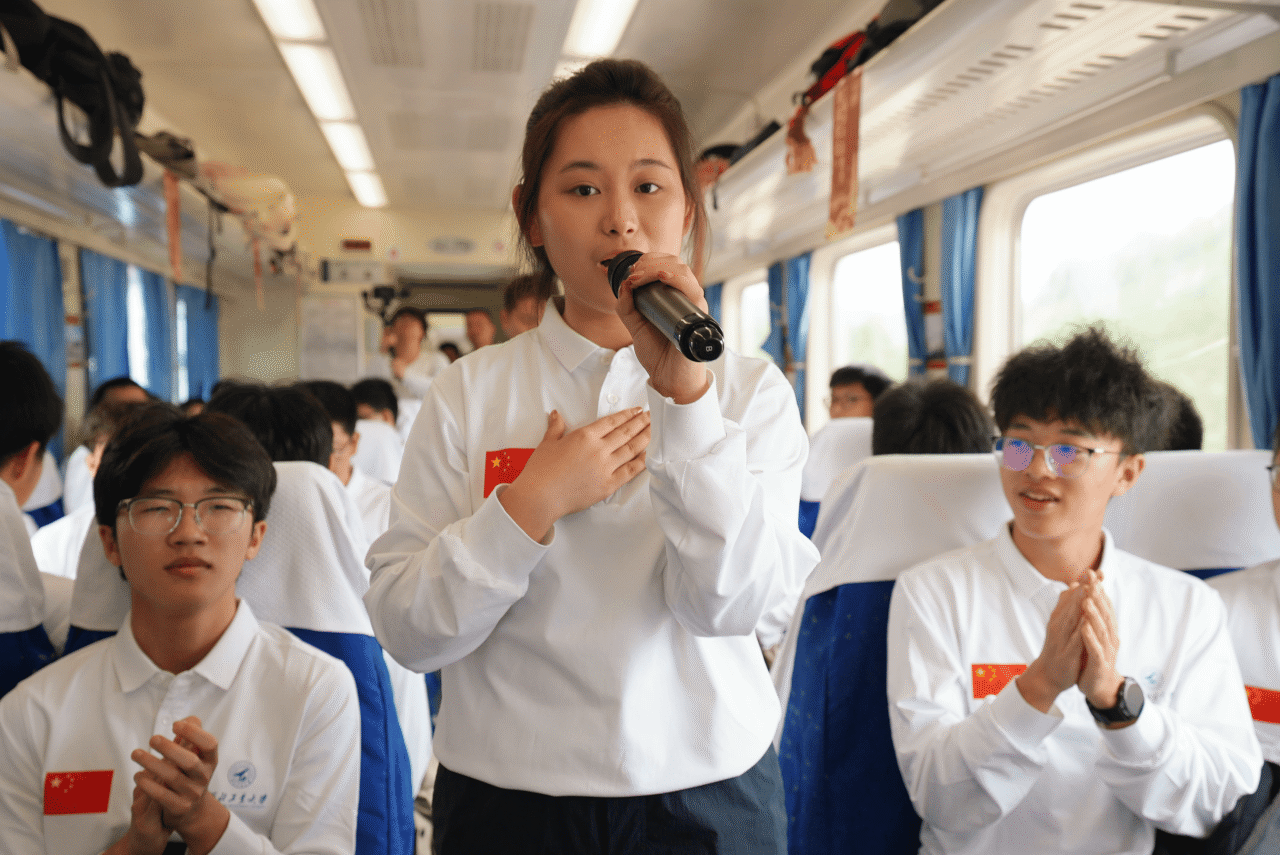 临近下车,大学生艺术团同学们带领全体学生齐声高唱《歌唱祖国》《保卫黄河》等歌曲,深情而嘹亮的歌声将车厢内的气氛推向高潮,表达了西工大学子对祖国的深切热爱与祝福。