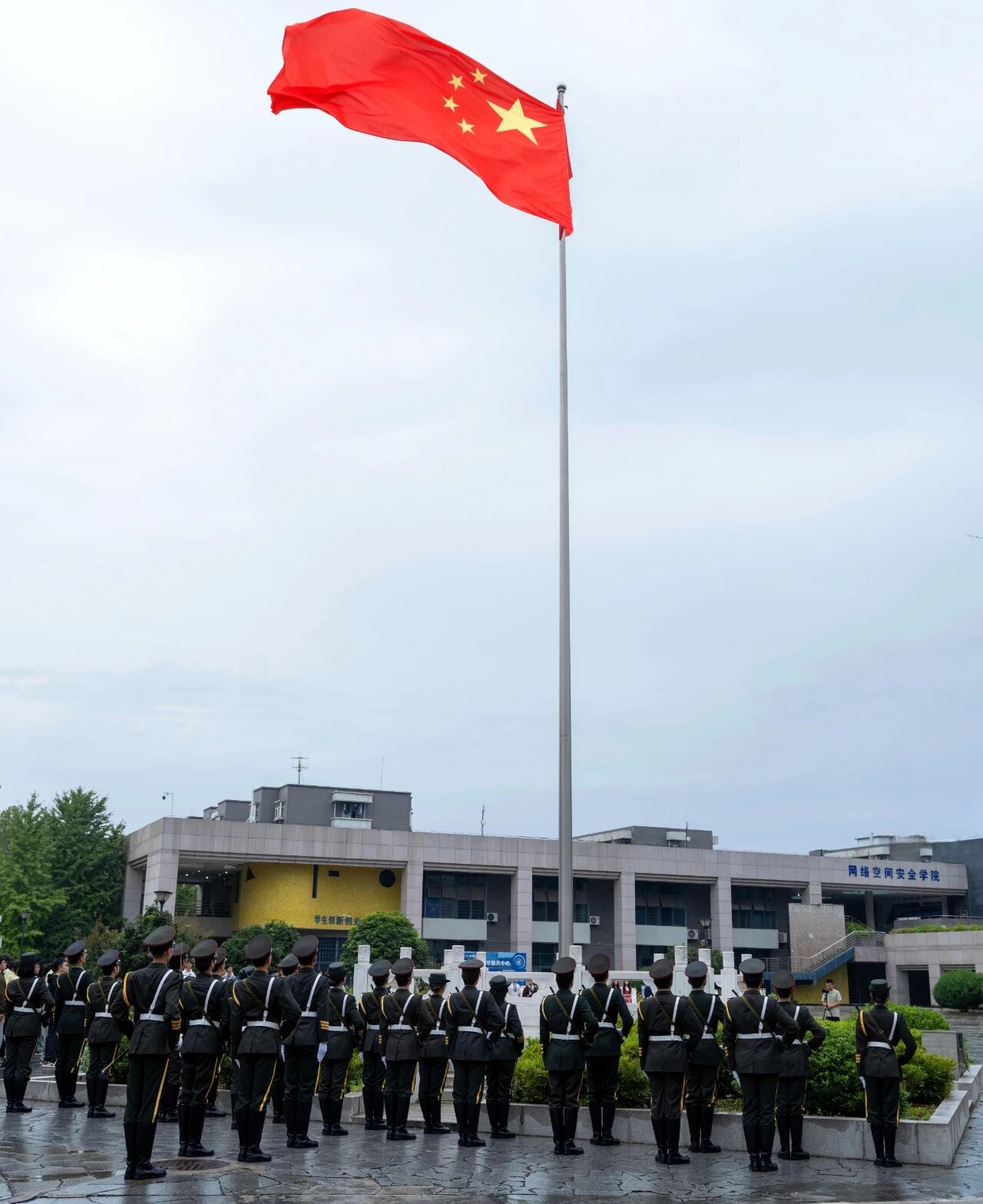 “齐步——走!”伴随着响亮的口令,学校国旗护卫队的同学们迈着整齐的步伐,护送国旗进场。升旗台前,行进停止,自发前来参加仪式的师生们庄严肃穆,此时,嘹亮的中华人民共和国国歌响起,在场师生以铿锵歌声、深情目光,注视着鲜艳的五星红旗冉冉升起,这一刻,爱党情、爱国情在每个人胸中升腾。