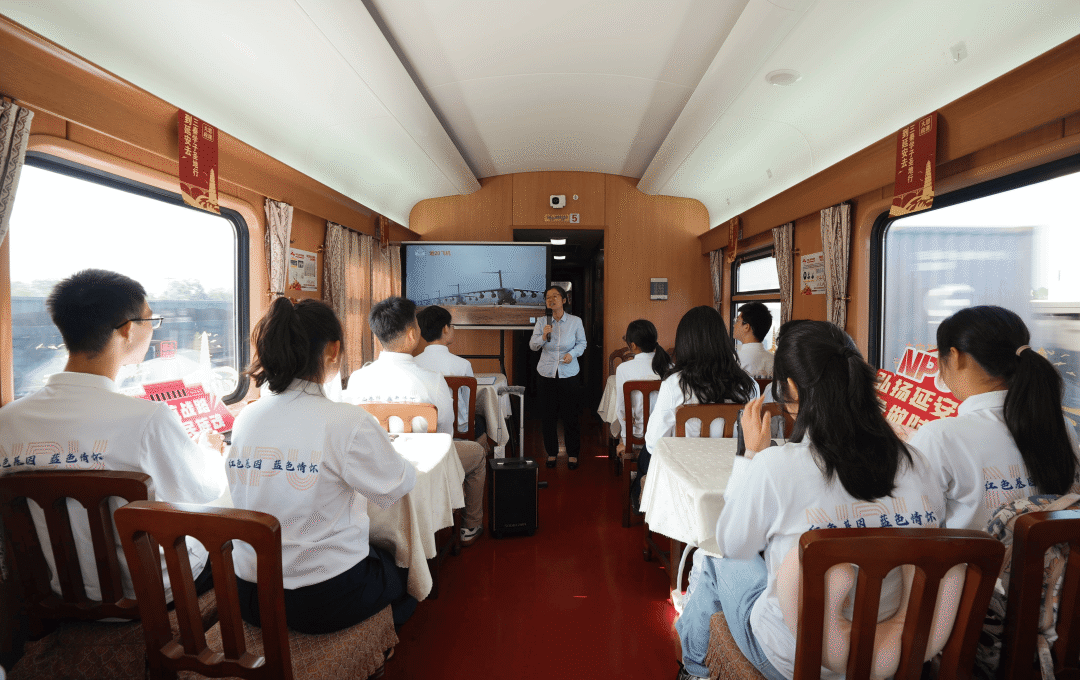 旅途中,学校还特别组织了专题党课、知识抢答、同唱红色歌曲等丰富多彩的活动。其中,延安市委党校的老师们讲述专题党课《到延安去》,通过讲授抗战时期爱国青年不惧艰险奔赴延安的光辉往事,引导青年学子学习他们对真理的追求、对民族的责任、对信仰的坚守。邀请了中国航空工业集团公司第一飞机设计研究院项目副总师黑文静等优秀校友讲授总师思政课,以总师校友秉持红色初心,为大国重器研制忘我奉献、攻坚克难所取得的卓越成就,激励青年学子弘扬“总师育人文化”,为国铸剑。激情澎湃的讲述,精彩生动的演绎引发了师生强烈共鸣,车厢内不时爆发出热烈掌声。