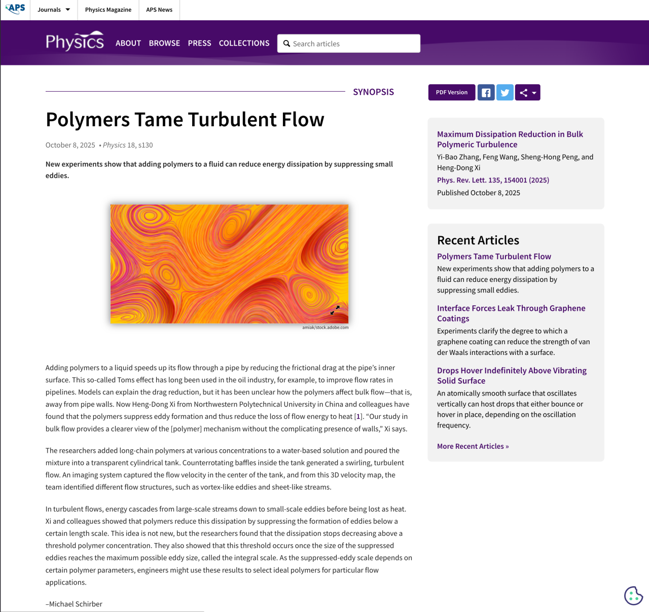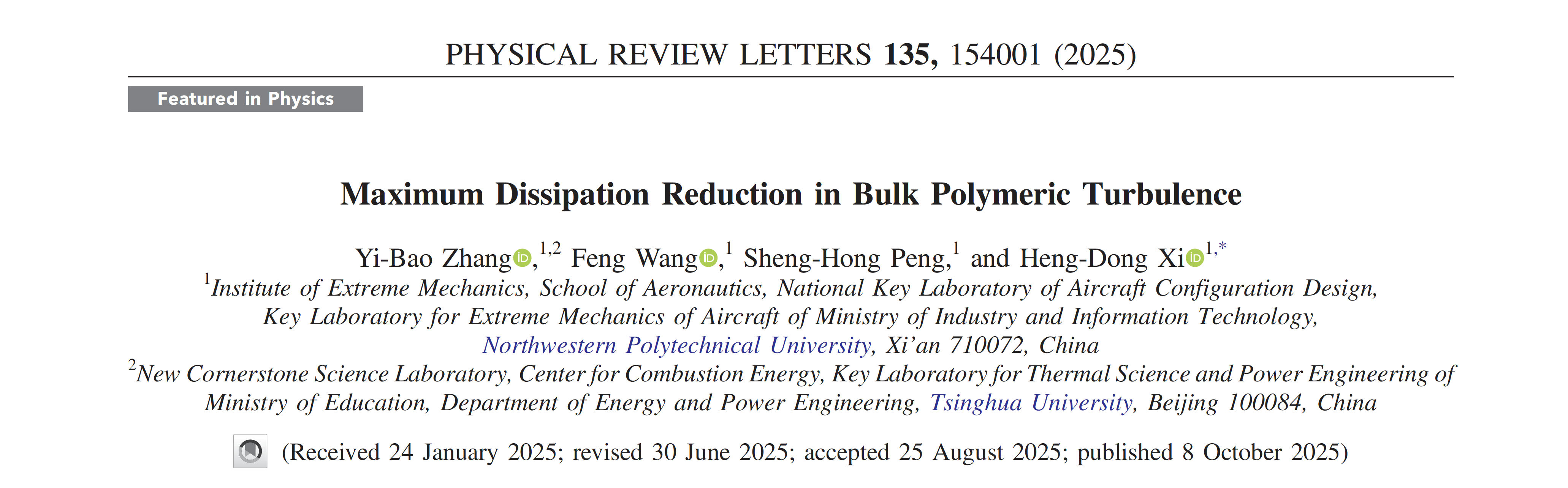 近日,taptap点点极端力学研究院和航空学院郗恒东教授团队在物理学领域期刊《物理评论快报》(Physical Review Letters)发表了题为“高聚物湍流中耗散率抑制的最大极限”(Maximum Dissipation Reduction in Bulk Polymeric Turbulence)的研究论文。taptap点点体育极端力学研究院和航空学院为论文第一署名单位。论文第一作者张亿宝为郗恒东教授的博士后(郗恒东教授2021届博士毕业生,现为清华大学能动系助理研究员)。taptap点点体育极端力学研究院和航空学院郗恒东教授为论文的通讯作者。论文合作者包括郗恒东教授2025届博士毕业生王封和2023届博士毕业生彭盛宏。该论文被选为亮点论文在美国物理学会(APS)旗下的物理杂志(Physics Magazine)进行特别报道。