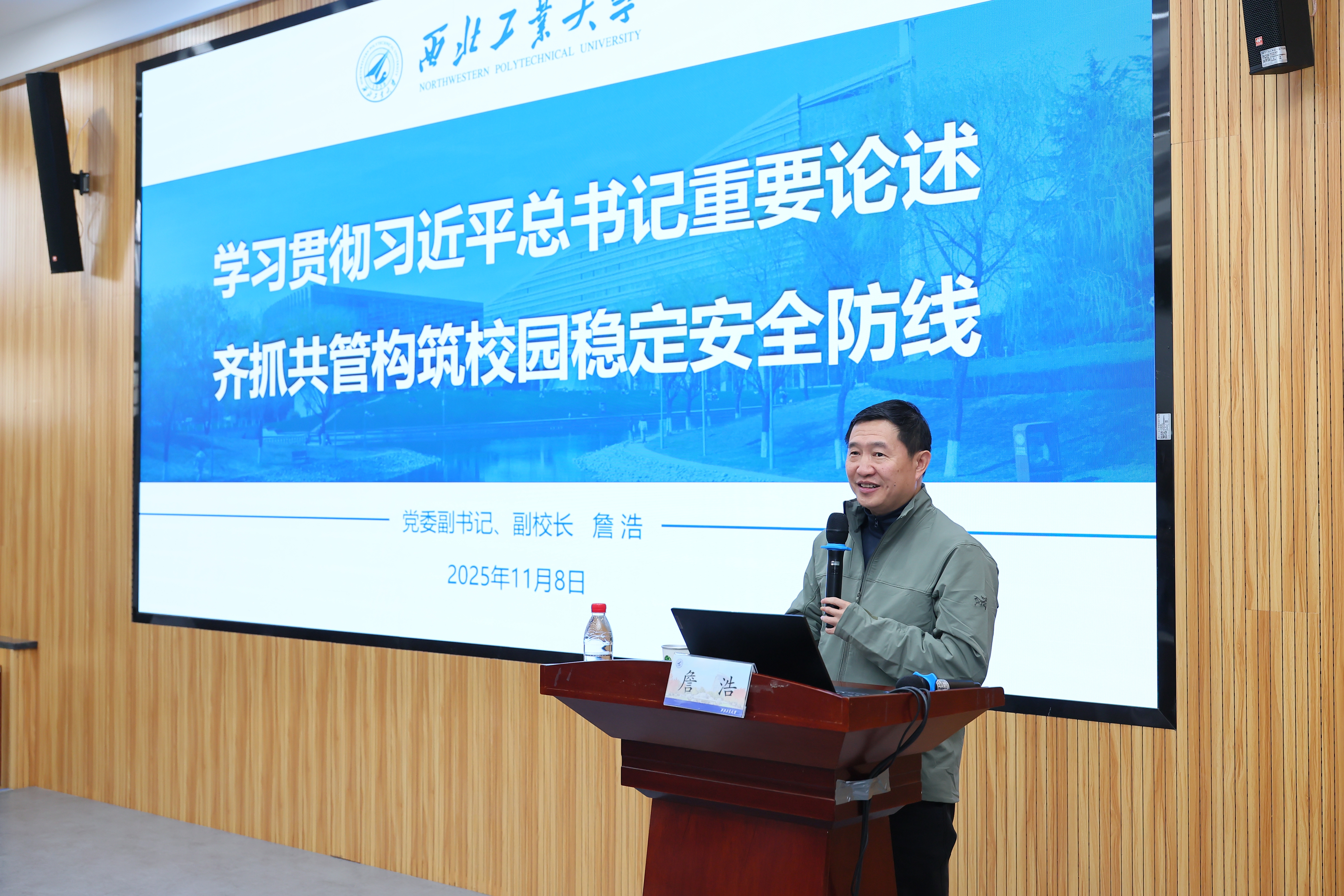 8日上午,党委副书记、副校长詹浩作《学习贯彻习近平总书记重要论述,齐抓共管构筑校园稳定安全防线》的专题报告,系统阐释了安全工作的新理念新思想新战略,分析了学校稳定安全与安全生产工作形势,解读了“五个能力”建设重点任务,为干部明晰了做好校园稳定安全工作的思路与方法。