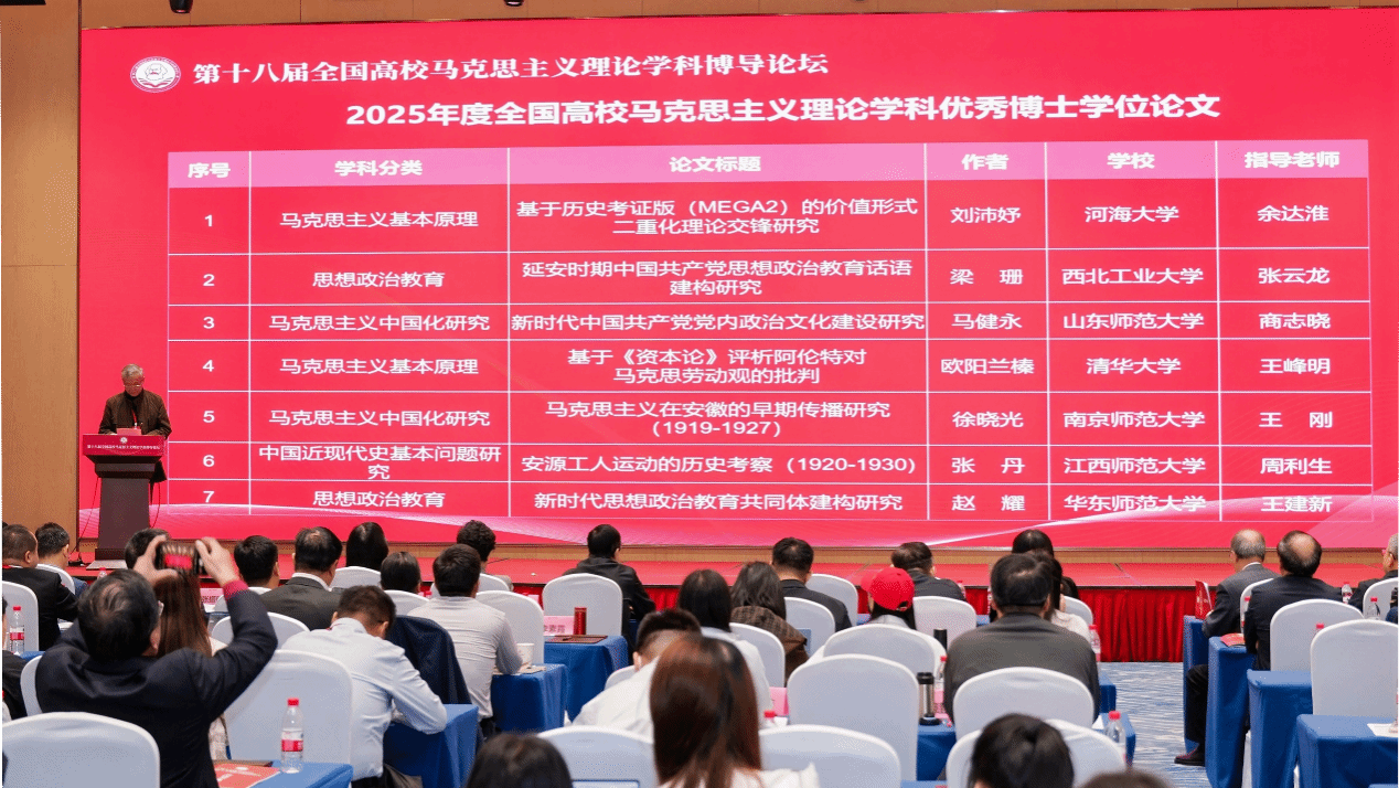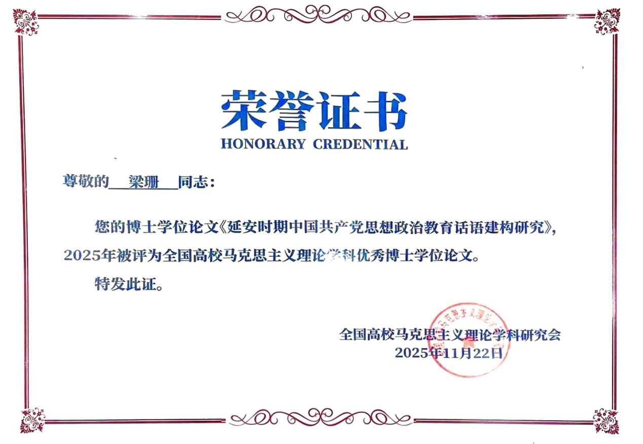 2025年11月22日,第十八届全国高校马克思主义理论学科博导论坛在海口举行,会议期间同步举行了2025年度全国高校马克思主义理论学科优秀博士学位论文颁奖仪式。taptap点点马克思主义学院博士生梁珊的博士学位论文《延安时期中国共产党思想政治教育话语建构研究》成功荣获该奖项,其指导教师为张云龙教授。