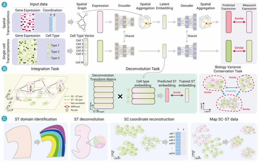在生命医学研究中,精确解析细胞在组织中的空间分布与功能联系对于理解器官结构及疾病演进至关重要。单细胞转录组学(single-cell transcriptomics, SC)测序技术虽能描绘单个细胞的基因表达全貌,但导致原始空间位置信息丢失;而空间转录组学(spatial transcriptomics, ST)测序技术能够保留细胞的空间信息,却面临测序分辨率低或检测基因数量受限的固有技术限制。如何有效整合两者的技术优势,克服现有测序数据的局限性,是当前计算生物学亟待解决的难题。为了解决这些挑战,尚学群教授团队提出了基于多任务优化策略的深度神经网络框架(stSCI,图1)。该方法通过设计异构数据融合模块,利用共享图注意力网络作为编码器,将多源异构的SC和ST数据投射到统一的、经批次校正的低维嵌入空间中。通过这种特征融合机制,模型在有效消除异构数据间技术差异与噪声干扰的同时,最大程度地保留了细胞间真实的生物学差异与拓扑结构特征。实验结果表明,模型在空间域识别、三维组织结构解析、细胞类型反卷积及单细胞空间位置重构等多个关键任务中,综合性能均优于现有主流方法。通过将该方法应用于沙门氏菌感染的小鼠结肠模型测序数据,研究团队不仅成功识别出关键的淋巴组织区域,还精准捕捉到该区域在感染过程中表现出的“延迟激活”动态响应模式,这一发现与已知的感染免疫动力学高度吻合。该工作为解析复杂组织微环境、理解疾病演进机制等生物学研究提供了高效的人工智能方法模型。
