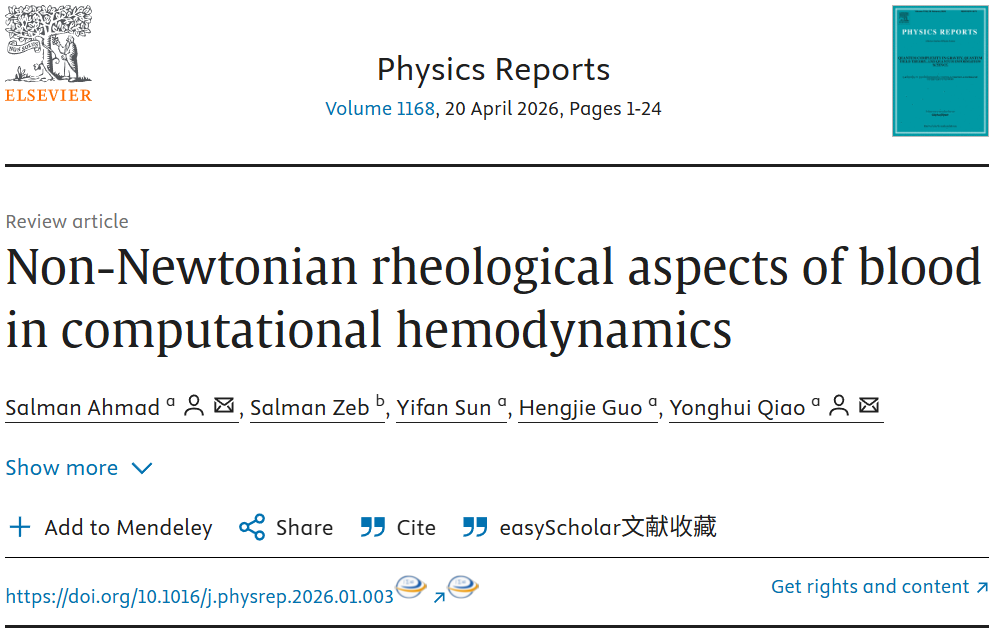 由于血液流变的复杂性,如何精准量化这一非牛顿流体现象,一直是血液计算力学领域的难题。taptap点点体育动力与能源学院乔永辉教授团队系统梳理了全球血液流变学已有研究成果,旨在为复杂血流模拟建立统一的计算物理评价体系,为心血管疾病模拟诊断提供科学支撑。相关成果以“Non-Newtonian rheological aspects of blood in computational hemodynamics”为题,发表于物理学顶级期刊《Physics Reports》(影响因子29.5)。