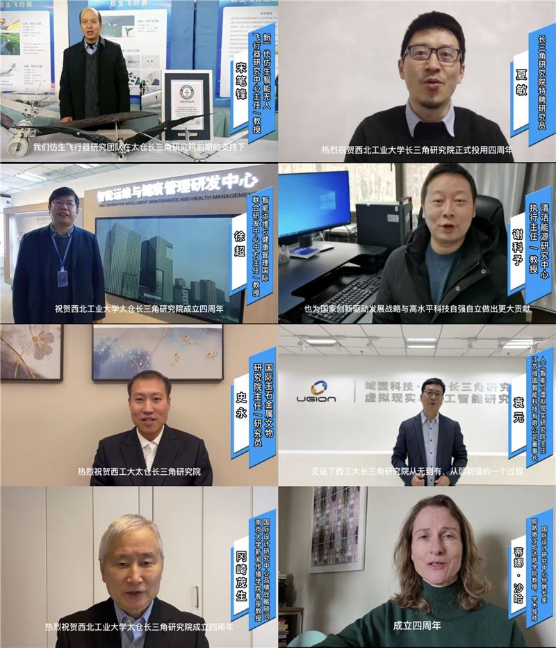 研究院入驻科研团队宋笔峰、贺亮、谢科予、史永四位教授,特聘专家夏敏、冈崎茂生、蒂娜·沙哈,以及首家入驻企业CEO、98级校友袁元纷纷发来云端祝福,对研究院表示感谢,祝贺投用4周年。