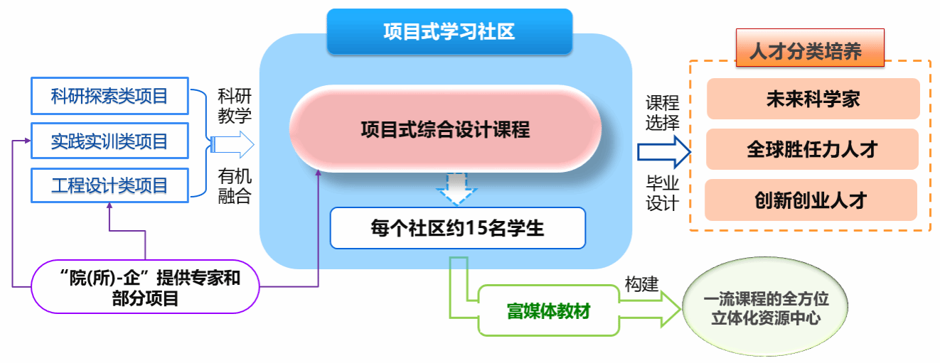 创建项目式学习社区,分层培养未来科学家、全球胜任力人才和创新创业人才。一是创新教学组织形式。通过构建综合性项目式学习社区,对未来科学家、全球胜任力人才和创新创业人才等提供分类培养载体和个性培养通道,推动宽口径与个性化的有机融合。学院建立20个学习社区,实现全院本科生项目式学习全覆盖。每个项目式学习社区由约15名学生/年级、7名以上校内社区导师、2名校外社区导师组成。建立首席教授责任制,对学生学习情况进行全过程考核和评价。在大二阶段,学生根据志趣进入项目式学习社区,精准接受学业指导;在大三阶段,以项目式综合设计课程为主线、以专业选修课程为辅,开展个性化教育;大四阶段,社区导师指导学生进行专业确认与选择,并负责学生在此期间的分层培养和特色教育。二是创新课程组织形式。以项目式综合设计课程为牵引,依托教学团队和科研团队,形成科研探索类项目、工程设计类项目和实践实训类项目课程体系,由各专业对应共建的“院所-企”提供与专业特点相适应的工程设计类项目和实践实训类项目。三是严格学生学业标准。明确课程设置内容、考核标准、项目式社区教师能力要求、学生准入准出规则和学分兑换标准等,保障项目式学习社区的健康高效运行。四是突出教师教育教学实绩。对进入项目式学习社区的“院所-企”校外专家进行聘任与考核,改革学院绩效考核模式,对进入社区的首席教授与社区导师的绩效分配予以倾斜。