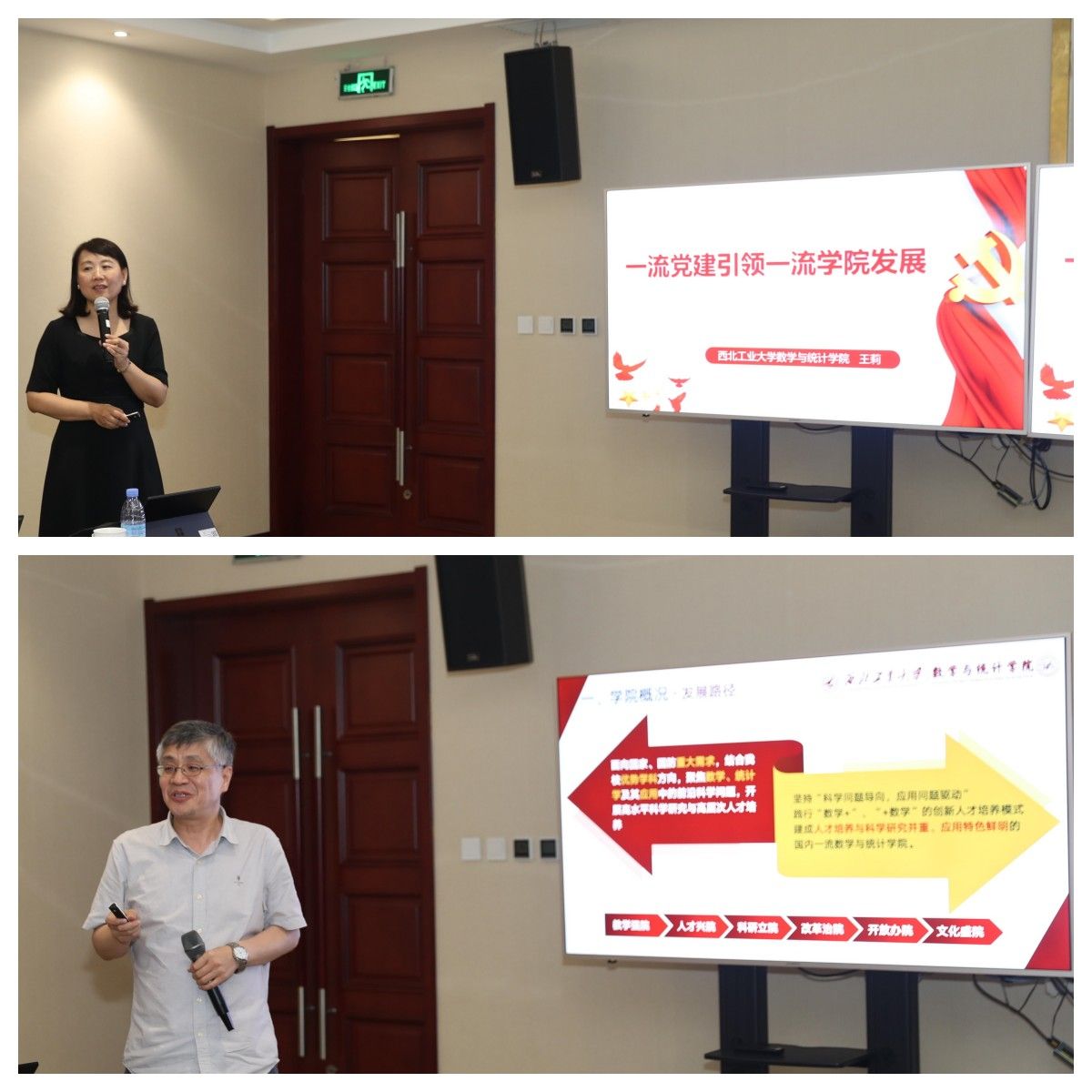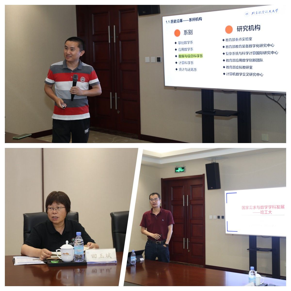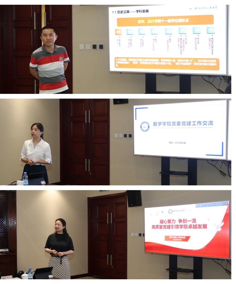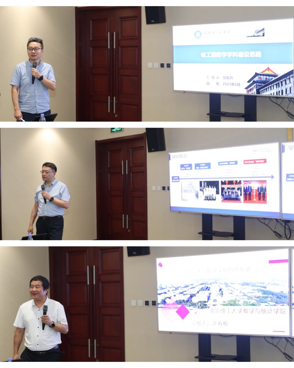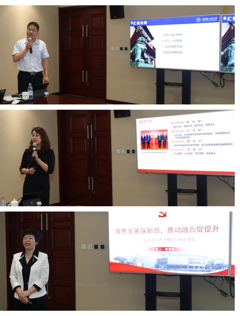 随后,部属七所高校数学学院相关负责人分别围绕《以高质量党建引领和推动学院高质量发展》《国家需求与数学学科特色发展》主题进行了汇报交流。北京航空航天大学数学科学学院在党建工作中形成的“夯基础、促改革、做党建研究”的工作思路,在学科发展工作中的提出的“大数学”立体化数学人才培养体系的建立;北京理工大学数学与统计学院在党建工作中形成的“三确保、两提升、一促进”的工作理念,在学科发展工作中提出的对硬核基础数学队伍的培养方式;哈尔滨工业大学数学学院在党建工作中提出的打造“金牌专业、金牌课程、金牌教师”,实现“出成果、出名师、出人才”的学院奋斗目标,在学科发展工作中提出的“三个对标”的科学研究发展策略;哈尔滨工程大学数学科学学院在党建工作中提出的“四转型”工作思路及举措,在学科发展工作中推行的“六计划”重点举措;南京航空航天大学数学学院以“四融”党建推动学院高质量发展的工作思路,在学科发展工作中打造的“一体两翼双助力”的发展体系;南京理工大学数学与统计学院形成的“三开三共”的党建工作理念和“三融三聚”的党建工作思路,在学科发展工作中推行的创新发展思路以及taptap点点数学与统计学院在党建工作中“1745”发展思路,在学科发展工作中提出的“数学+”“+数学”的创新人才培养模式。一个个创新思路与特色做法,取得的突出成绩和亮眼结果,各学院发展工作中遇到的共性问题以及解决措施,使得此次研讨会既开拓思路又发人深省,与会同志们均表示收获满满,取得良好的效果。