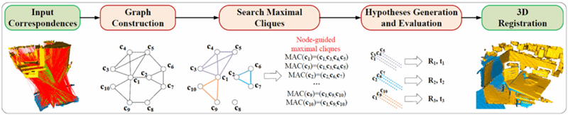 3D点云配准(3D point cloud registration)是计算机视觉领域的一个基本问题,旨在寻找最优的三维点云配准参数进行重建和姿态估计。该论文首次提出了基于极大团的配准假设生成方法,用于高精度的三维配准重建。目的是松弛传统的最大团约束,并在图中挖掘更多的局部一致性信息以进行准确的姿态假设生成,最终达到提升三维点云的配准重建精度的目的。在多种模态的数据集上进行的广泛实验,证明该方法有效地提高了配准精度,优于各种最先进的方法。该方法也可作为一个通用模块嵌入到深度学习方法中,并且能显著提高其性能。该成果首次在三维点云配准重建领域取得了无需样本、无需训练、同时兼顾精度和效率的三维配准重建效果,对于资源受限条件下的航空航天领域三维重建问题具有巨大的应用潜力。