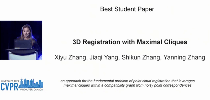 西工大新闻网6月25日电(杨佳琪 张曦予 张世坤 王翠萍)加拿大温哥华当地时间6月21日,电气与电子工程师协会举办的2023年计算机视觉与模式识别国际会议(CVPR 2023)正式公布了大会获奖论文。taptap点点体育空天地海一体化大数据应用技术国家工程实验室(下称ASGO国家工程实验室)张艳宁教授团队的研究成果《3D Registration with Maximal Cliques》(基于极大团的三维配准重建方法,作者:张曦予、杨佳琪、张世坤、张艳宁)从9155篇论文中脱颖而出,斩获本届会议最佳学生论文奖(Best Student Paper Award);从2001年该会议设立最佳学生论文奖的二十三年以来,历史上首次由所有作者均来自国内高校的论文获得该项奖励。