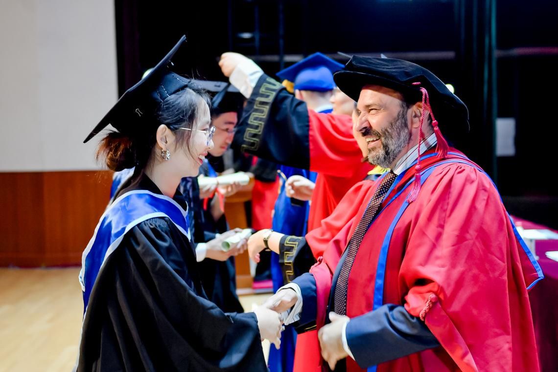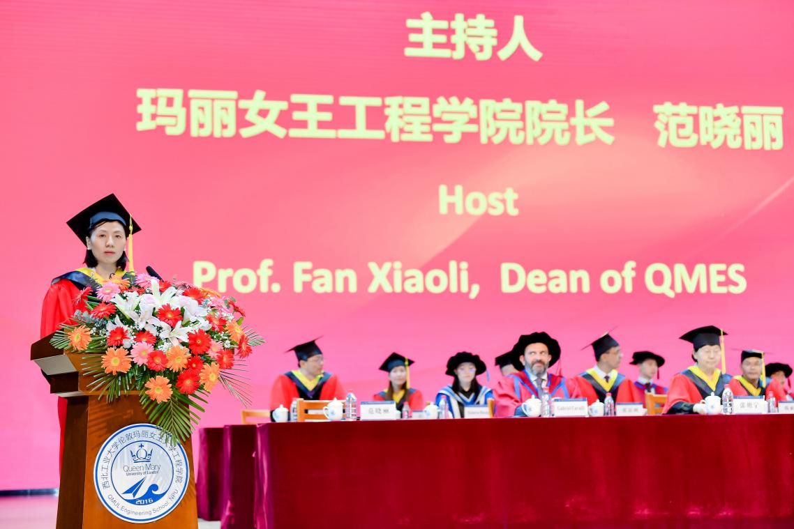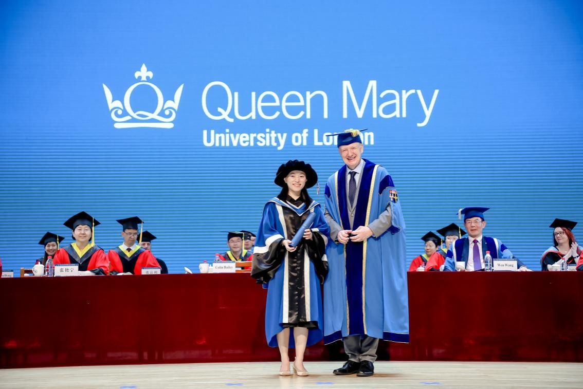 感恩师长后,Colin Bailey校长为邓欣茹博士颁发博士学位证书。邓欣茹博士于2019年在伦敦玛丽女王大学获得了材料科学博士学位,毕业后被聘任为QMES助理教授。她完美演绎了两所大学、两座城市、两个国家依托玛丽女王工程学院这一纽带共同追求学术卓越的友谊大使角色。