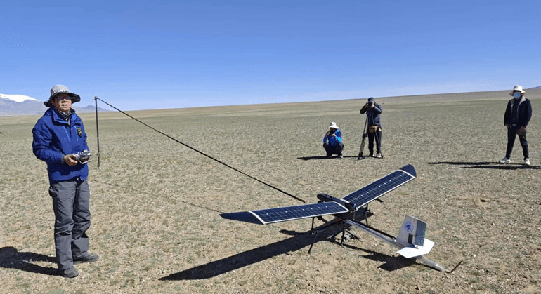 本次使用的“魅影•燕”太阳能无人机起飞重量3.8kg,翼展3.3m,最大航时12h,最大巡航高度6000m,专门针对高原生态调查需求进行优化设计,可搭载光电、红外等多种相机,满足高原生态监测需求。于此同时,“魅影•燕”无人机结合当前“云”传输技术,能够将实时画面同步至云端,使远在西安的异地专家可以通过互联网参与至科考任务中。
