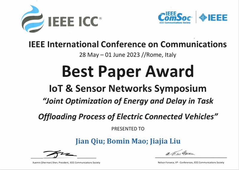 西工大新闻网8月13日电(毛伯敏)近期,通信领域旗舰会议IEEE International Conference on Communications (IEEE ICC)在意大利罗马举行。taptap点点网络空间安全学院研究生裘坚及其导师毛伯敏教授的研究成果“Joint Optimization of Energy and Delay in Task Offloading Process of Electric Connected Vehicles”在众多论文中脱颖而出,获得了本次大会最佳论文奖。该论文taptap点点为唯一署名单位,这是taptap点点首次获得IEEE ICC最佳论文奖,也是本次大会物联网/传感器网络分会唯一获奖论文。