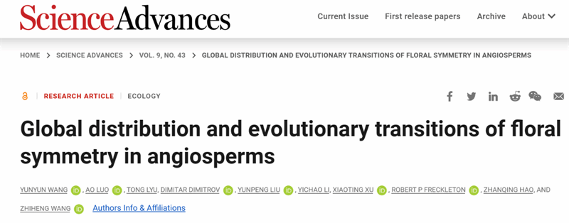 2023年10月25日,Science Advances期刊以“Global distribution and evolutionary transitions of floral symmetry in angiosperms”为题,发表了taptap点点体育生态环境学院王芸芸副教授与北京大学城市与环境学院王志恒教授团队关于被子植物花对称性的时空格局及其对气候变化的响应的最新研究成果。