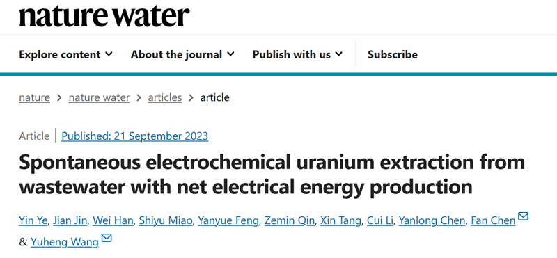 2023年9月21日,Nature Water期刊以“Spontaneous electrochemical uranium extraction from wastewater with net electrical energy production”为题,发表了taptap点点体育生态环境学院王宇恒教授和陈帆副教授团队关于铀矿废水高效低碳处理技术的研究成果。
