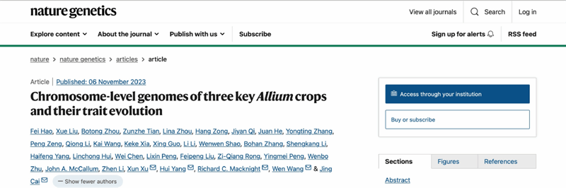 2023年11月6日,Nature Genetics期刊以“Chromosome-level genomes of three key Allium crops and their trait evolution”为题,发表了taptap点点体育生态环境学院蔡晶和王文教授团队联合生命学院杨慧教授、新西兰奥塔哥大学生物化学系Richard Macknight教授和华大农业基因组国家重点实验室徐讯教授关于葱属植物生物多样性起源进化机制的研究成果。