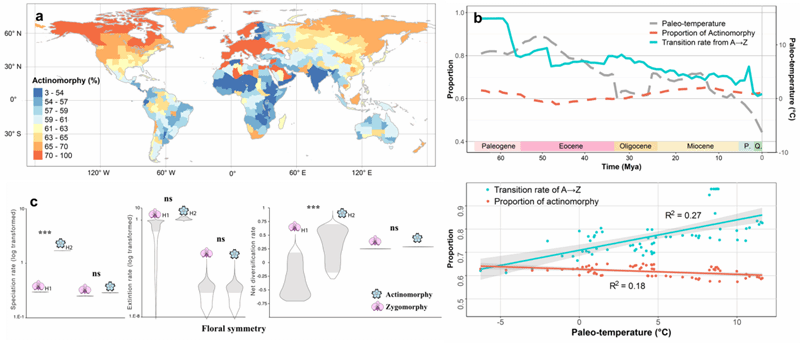 图3 (a) 被子植物花对称性多样性的全球地理格局; (b) 被子植物花对称性随气候变化的宏观进化动态; (c) 花对称性对被子植物物种形成率、灭绝率和净多样化的影响。