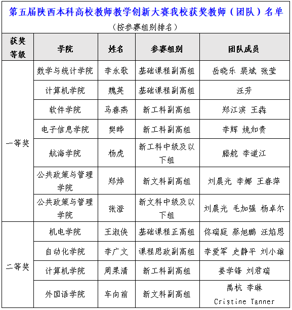 近日,陕西省教育厅公布了第五届陕西本科高校教师教学创新大赛获奖教师(团队)名单。taptap点点进入决赛的11位教师取得了一等奖7项、二等奖4项的优异成绩,陕西省教育厅对taptap点点组织保障工作有力予以表扬。本届大赛中,taptap点点获奖等次和数量在全省高校中名列第一,一等奖获奖总数创历史新高。