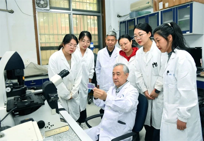 商澎教授和团队成员一起讨论相关实验