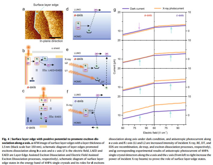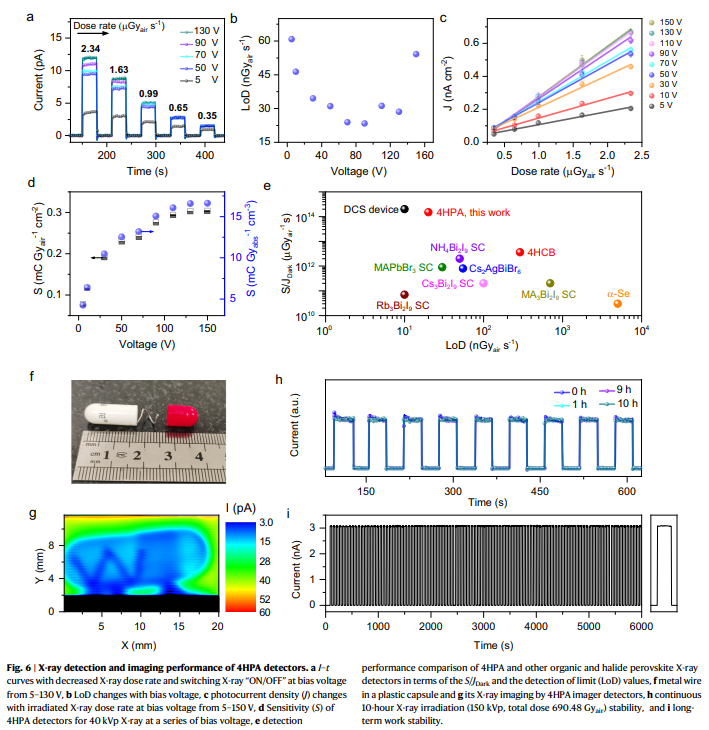 研究亮点三:基于积分电流法,4HPA探测器对40 kVp的X射线探测灵敏度高达16612 μC Gyabs-1cm-3,检测限低至20 nGyairs-1,其性能在690 Gyair的X射线辐照后未表现出任何退化。