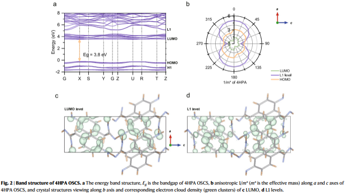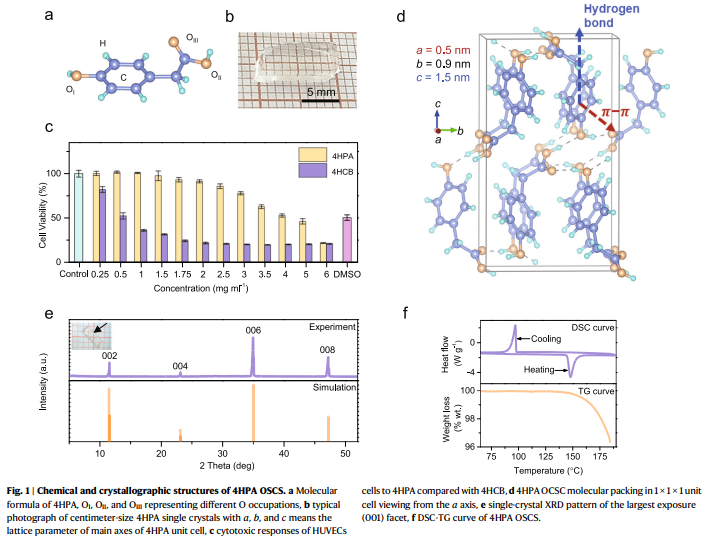 研究亮点一:通过将4HCB(HO-C6H4-CN)分子中具有生物毒性的-CN替换为乙酸基(-CH2COOH),得到了四羟基苯乙酸(HO-C6H4-CH2COOH,4HPA)单晶,其生物兼容性与碳材料类似,高压下的电子迁移速率接近优异的钙钛矿材料FACsPbBr3。