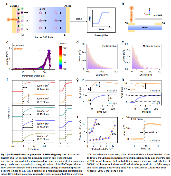 从坐一次飞机,过一次安检,拍一次X光片,到载人航天工程,电离辐射无处不在,它在改变我们生活的同时,也带来巨大的安全隐患。尤其是随着电离辐射在医学诊疗领域的广泛应用,开发新型实时、快响应、高分辨的可穿戴/可植入式的个人辐射剂量仪对于辐射安全监测与诊疗方案制订具有重要的意义。而传统的无机辐射探测器例如CdZnTe,Si及CsPbBr3等,存在着生物毒性以及高成本等问题。在过去的十年,尽管有机单晶半导体(例如:四羟基苯甲腈,4HCB),已被证明可以实现X射线、带电粒子以及快中子的直接探测。但相比于传统的无机半导体,4HCB探测器仍存在响应速率过慢的问题,尤其是在使用脉冲法进行能谱探测时,其探测时间长达数十分钟,严重限制了实时的辐射监测应用。