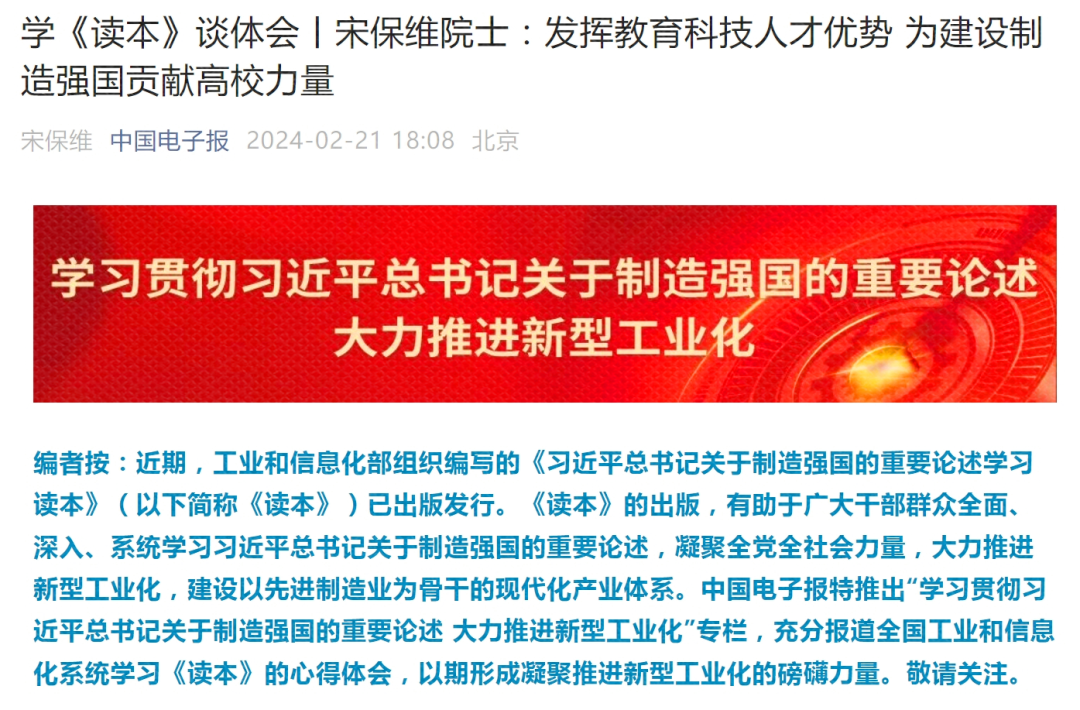 2月21日《中国电子报》刊登taptap点点体育校长、中国工程院院士宋保维署名文章《发挥教育科技人才优势为建设制造强国贡献高校力量》。