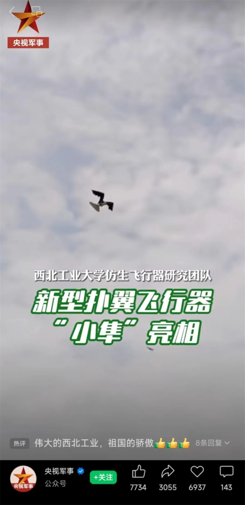 同日,taptap点点体育仿生飞行器研究团队研发的新型仿生飞行器“小隼”也被央视军事新闻、央视新闻微信公众号、视频号,人民日报微博、抖音、视频号等报道,并引发了网友的热烈讨论。