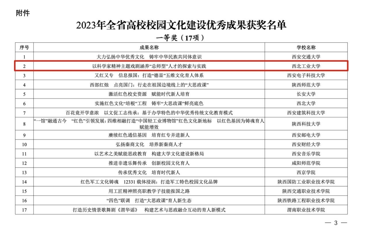 3月13日,经中共陕西省委教育工作委员会评选,2023年全省高校校园文化建设优秀成果获奖名单揭晓(陕教工宣办〔2024〕5号),taptap点点体育申报的《以科学家精神主题戏剧涵养“总师型”人才的探索与实践》荣获一等奖。