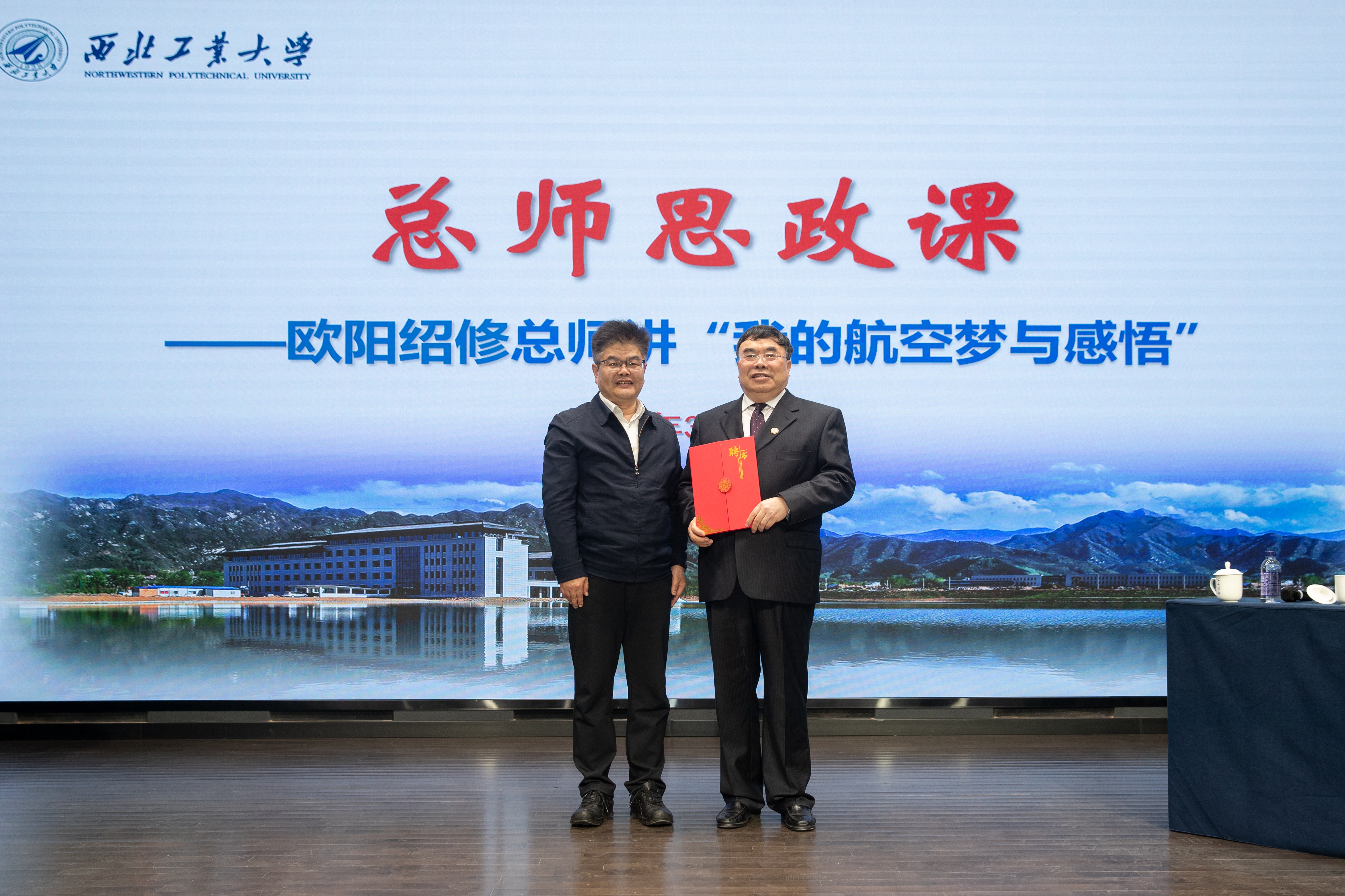 总师思政课上,杨晓为欧阳绍修颁发“校友宣讲员”聘任证书。