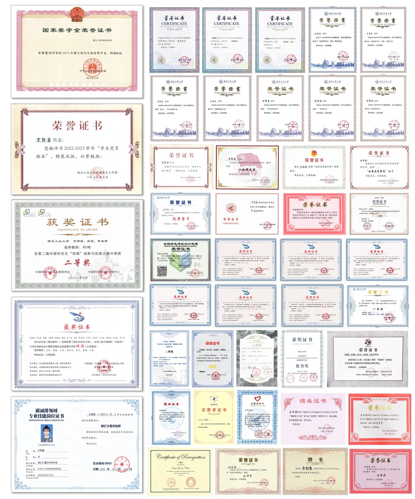 截至目前,发表和参与论文多篇、获公开国家发明专利2项、授权外观专利1项,主持并独立完成硕士研究生实践创新能力培育基金1项。基于前期积累,宋郭睿成功考取了国家碳汇计量评估师。功夫不负有心人,研究生第一学年她获得2023年研究生国家奖学金、“优秀研究生”、一等学业奖学金、一等奖学金等奖励和荣誉称号。