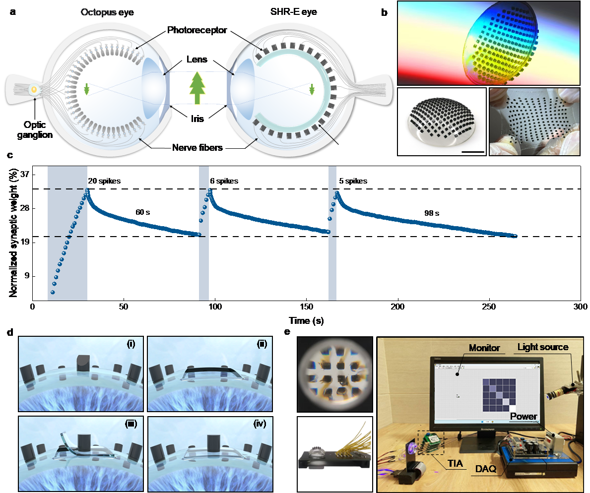 近日,在taptap点点柔性电子基础学科研究中心的支持下,taptap点点体育柔性电子基础科学中心黄维院士与南京工业大学刘举庆教授、刘正东副教授合作报道了一种基于离子凝胶异质结光感受器的生物眼启发型自驱动视网膜形态眼(SHR-E)。它具有宽光谱感知(365至970 nm)、宽视场(180°)和光突触(双脉冲异化指数为153%)行为,能够实现生物视觉系统的光学成像和运动跟踪功能。重要的是,该仿生眼以离子为信号传输的媒介,与生物体中信号传递的方式相似,从而实现了无需要外部能量输入的宽视场探测和高效的视觉信号处理。值得指出的是,由于离子凝胶本征具有的自愈合性,该仿生视网膜具备了移植修复能力,通过替换功能失调的光感受器,实现视网膜的移植修复,进而恢复视觉功能。此外,其出色共形能力使其能够轻松贴合任意几何形状,为未来在复杂多场景中的应用提供了无限可能。该研究工作不仅为人工视觉系统的发展提供了新的方向,也为生物电子学和类脑视觉领域的深入探索奠定了基础。相关研究工作以“A bionic self-driven retinomorphic eye with ionogel photosynaptic retina”为题发表在国际著名期刊Nature Communications(《自然•通讯》)上。