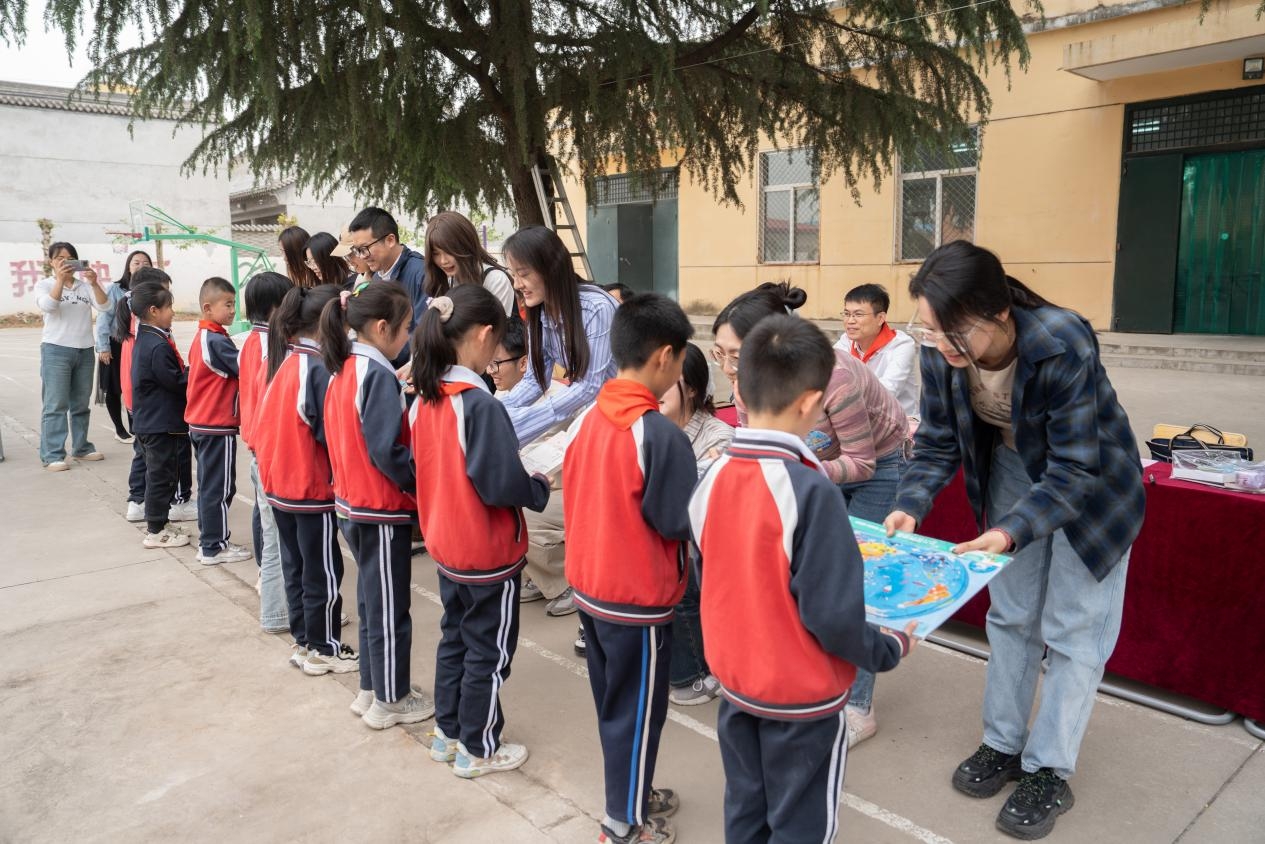 在这里,西工大师生们与送军小学师生进行了一场别开生面的文化交流活动。西工大出版社社长高大力强调了开展此次读书日回访活动的意义,希望阅读改变生活的种子能在小学生的心里慢慢发芽,也希望同学们从阅读中去看见更大的世界,中外师生一堂也能促进中外文明的交流互鉴,要投身阅读,关注文化的力量。西工大外国语学院学生代表左晶莹从幼时阅读《八十天环游世界》从而埋下“看世界”的种子为开端,讲述了她“从书中读世界,到用双眼看世界,再到从世界见自己”的走出去见世界之大的故事。国际教育学院的留学生代表ALEXANDRI IQANNA OURANIA用希腊神话与奥林匹克运动等文化标志,带领送军小学学生认识希腊走向世界,同时也深情分享了她在中国求学并决定留在中国工作的留学故事。送军小学学生代表也分享了自己的读书心得。在外国语学院党委副书记张桑桑的领读下,大家共同诵读了张载的横渠四句与费孝通先生处理不同文化关系的十六字箴言,领悟“构建人类命运共同体”这一理念背后所承载的文化根脉与大国智慧。恰逢“中国航天日”前夕,全体师生共同放飞“小火箭”,唱响“探索浩瀚宇宙、发展航天事业、建设航天强国”的主旋律。此外,西工大师生还向送军小学捐赠了图书,建立了“友谊书角”,为小学生们提供了更多的阅读资源,助力他们拓展视野,增长知识。