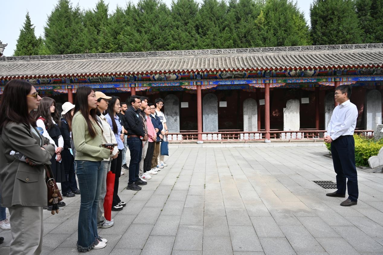 第三站,“书香号”来到张载祠,实地感受一场跨越千年的思想共鸣。“为天地立心,为生民立命,为往圣继绝学,为万世开太平”的先贤思想,与如今“和平合作、开放包容、互学互鉴、互利共赢”的丝路精神共同激荡,人类命运共同体融通中国梦与世界梦。在讲解员的带领下,中外学生共同了解了先贤张载波澜壮阔的一生与关学的思想内核。西工大外国语学院学生代表蔡欣雨同学用双语为留学生再次解析横渠四句的深刻内涵。国际教育学院留学生代表MARSEL结合自身留学经历,赋予横渠四句“目标明确、不断超越、学有所用,反馈社会”的文化视角解读。