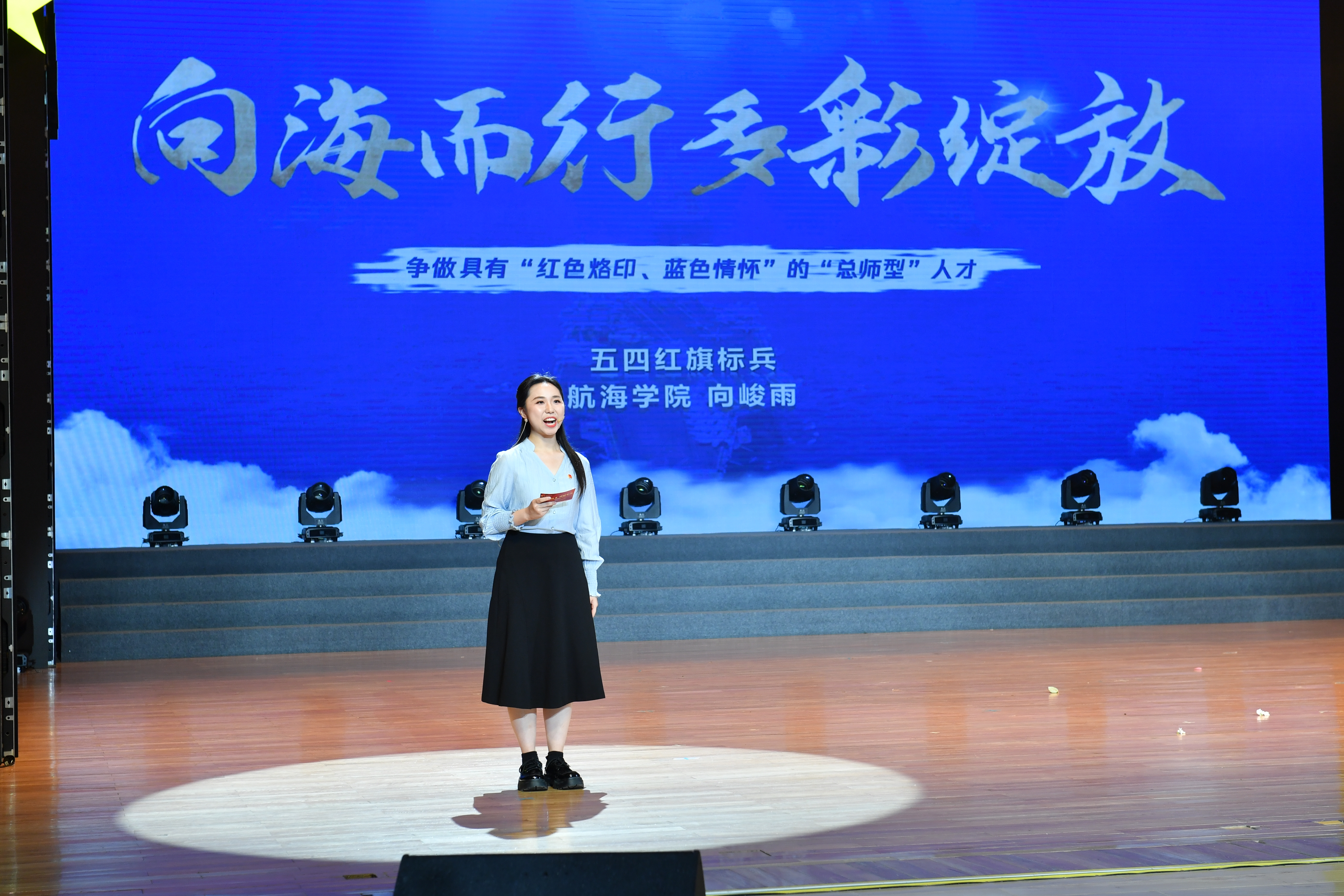 2024年学校五四红旗标兵代表、航海学院2022级博士研究生向峻雨以“向海而行,多彩绽放”为主题,分享在青春赛道上踔厉奋发、步履不停的榜样故事,呼吁taptap点点全体团员青年争做具有“红色烙印、蓝色情怀”的“总师型”人才。