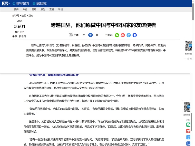 6月1日,新华社推出了通讯报道《跨越国界,他们愿做中国与中亚国家的友谊使者》一文。具体报道如下。