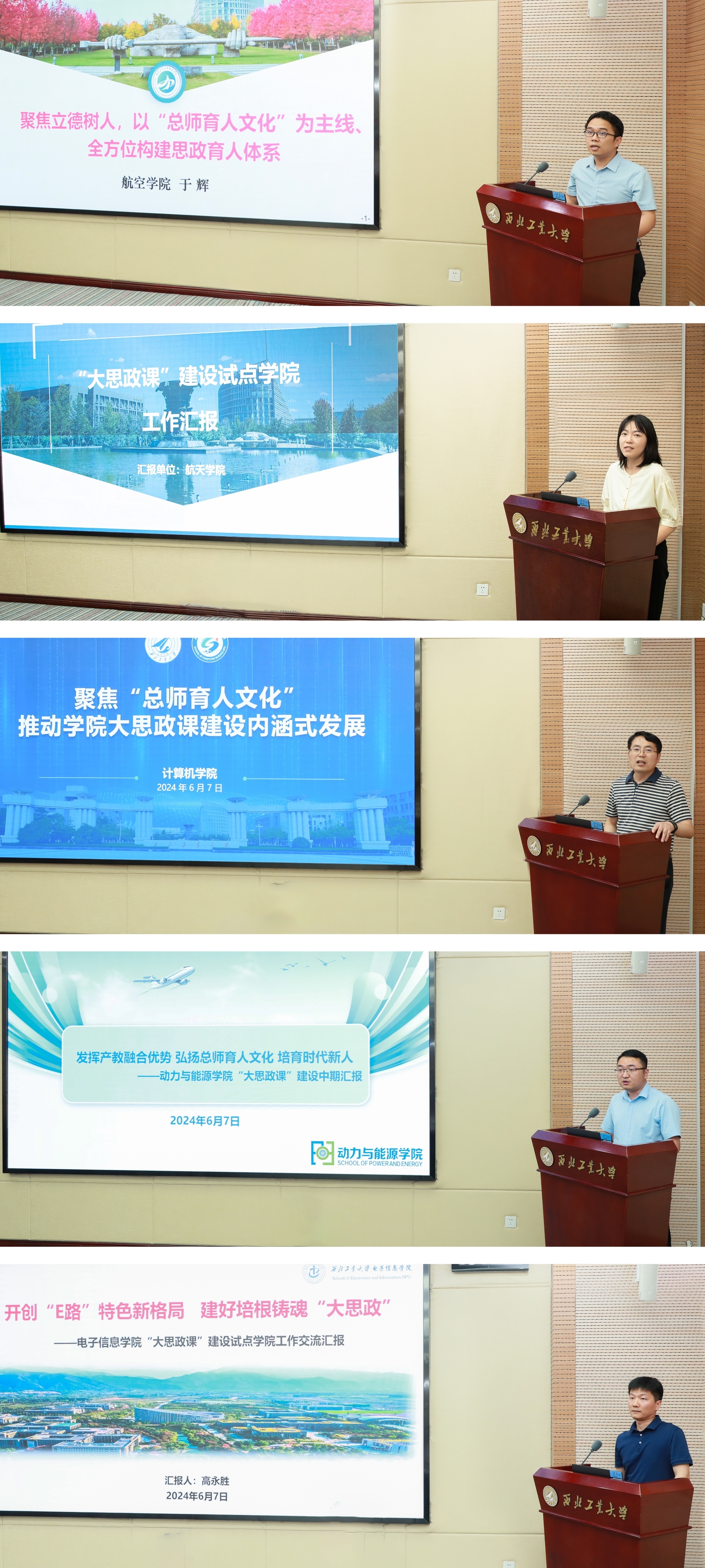 会上,学校首批“大思政课”建设试点学院围绕已开展的重点工作、存在不足及下一步计划,对“大思政课”建设成效进行了介绍。航空学院开设《大国重器》思政课程,开展翱翔育人、航空文化宣传系列思政教育活动,建设“总师文化长廊”,推出《问天少年》西工大专刊,开展“小航模 大梦想”大思政实践课堂。航天学院以“红色根、航天魂”为特色,把思政课堂延伸到航天发射一线,带领学生走进航天主机院所,挖掘航天精神教学素材,开展总师校友思政课,推进校内外协同育人。动力与能源学院探索“一课多师”的教学模式,与中国航发联合推进“大思政课”建设,出版思政案例汇编,发挥产教融合优势,遴选青年教师赴国防主机院所挂职锻炼,推动实践教学落地见效。电子信息学院构建“E路”特色“大思政课”建设新格局,围绕航电总师故事、电子驱动创新发展、信息引领赋能科技等学院特色,与思政课教师集体备课,建立校外实践教学基地。计算机学院强化数字赋能,打造思政建设数智化大平台,发起“计算报国”大师系列讲堂,组织开展《康继昌》话剧展演,与计算机专业紧密相关的科研院所共建思政教育基地。