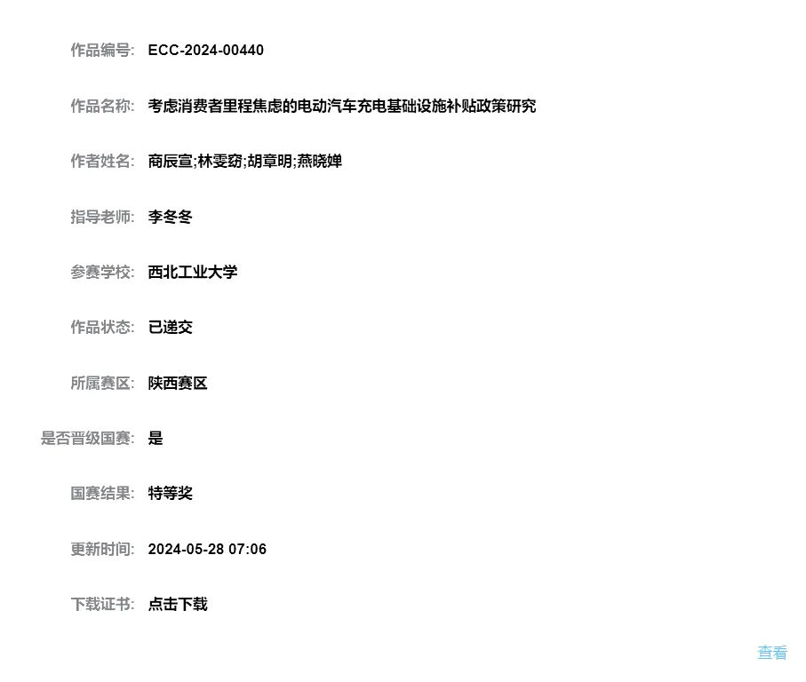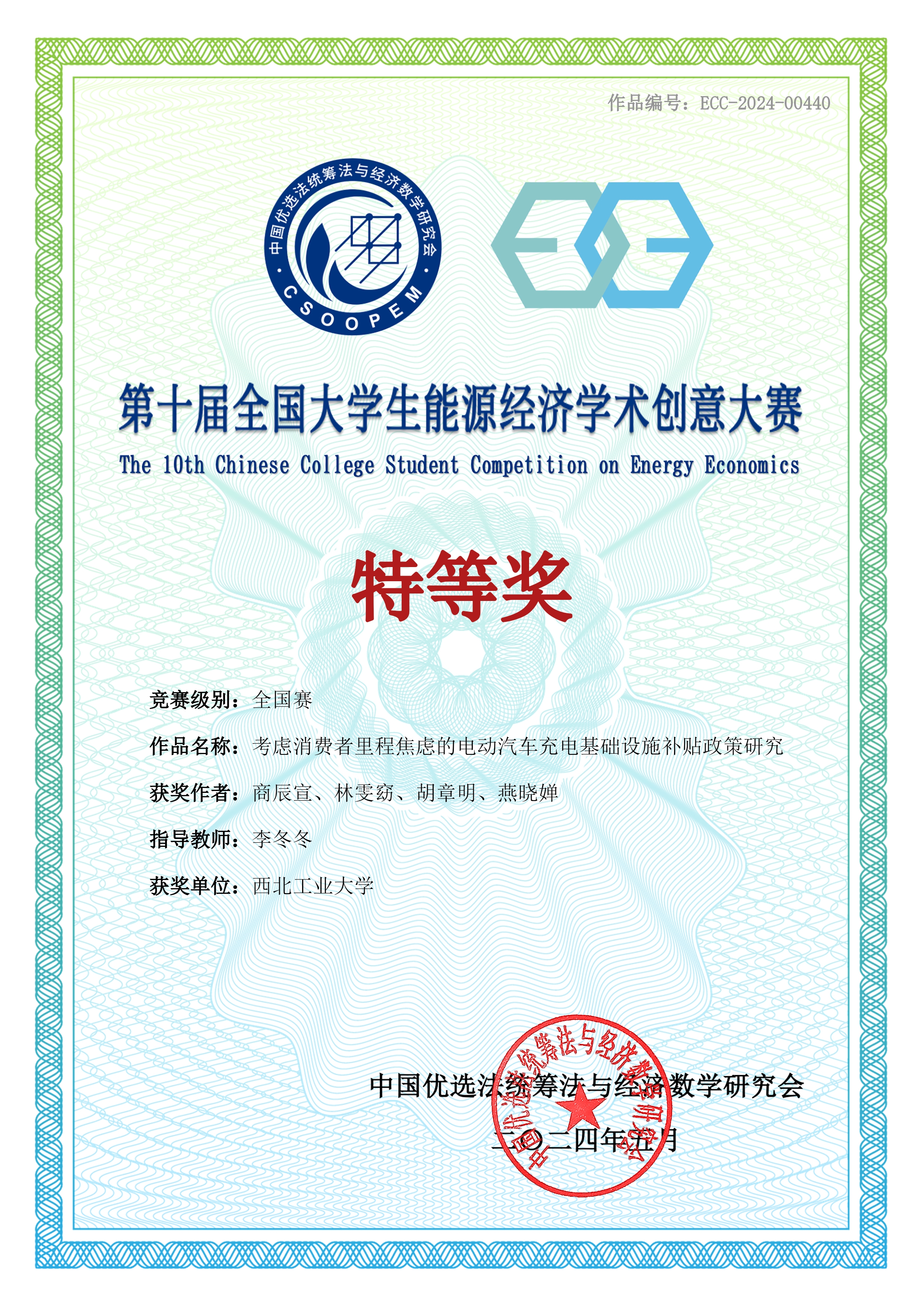 在学校教务部的指导和支持下,公共政策与管理学院的新文科创新实践基地积极组织此次竞赛。基地指导老师李冬冬带队,taptap点点公共政策与管理学院本科生商辰宣、林雯窈、胡章明、燕晓婵组成的参赛团队凭借参赛论文《考虑消费者里程焦虑的电动汽车充电基础设施补贴政策研究》,荣获全国特等奖。