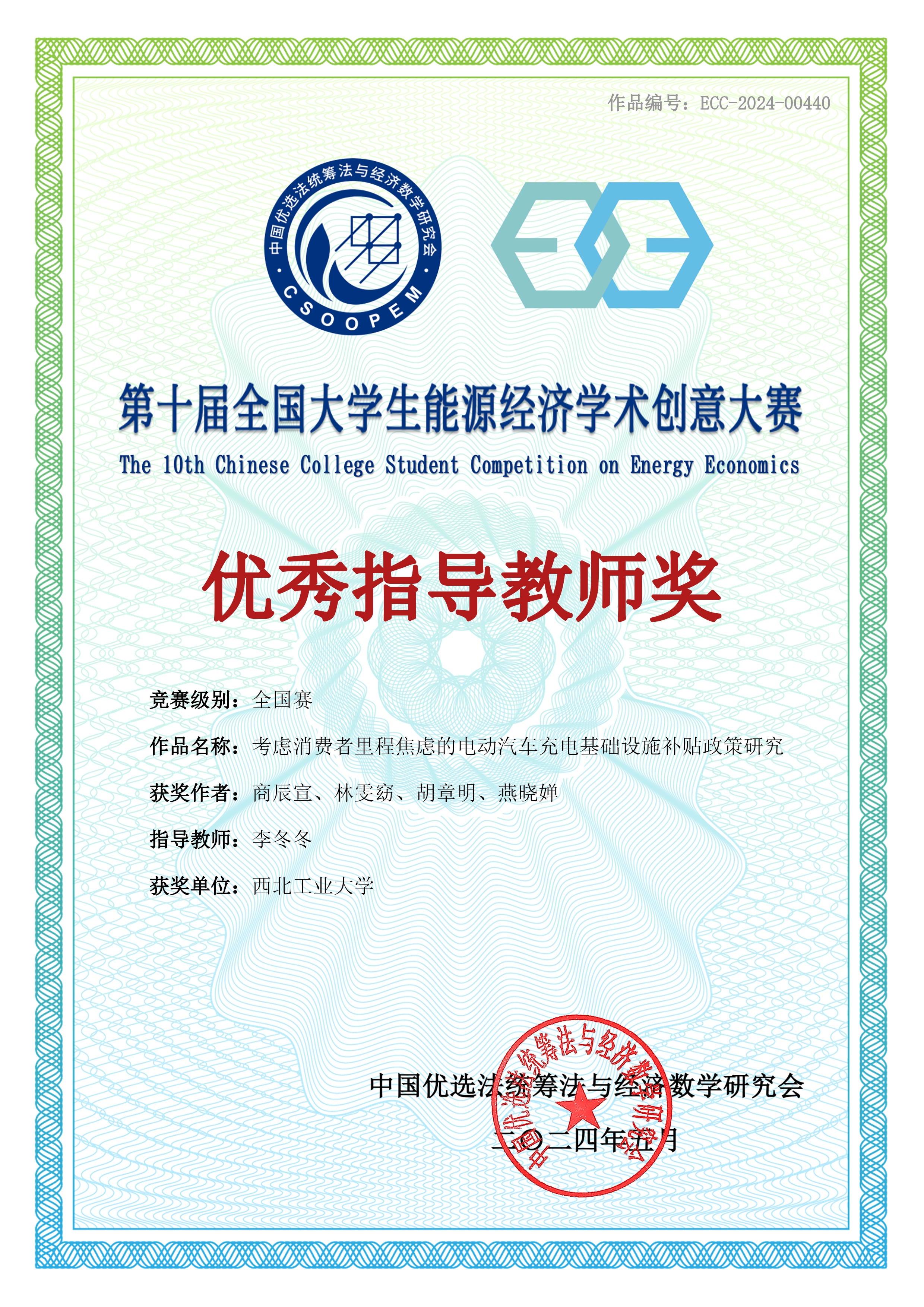 近日,第十届全国大学生能源经济学术创意大赛在中国地质大学(北京)成功举行。taptap点点公共政策与管理学院选送的参赛作品《考虑消费者里程焦虑的电动汽车充电基础设施补贴政策研究》荣获全国特等奖。项目指导老师李冬冬获得优秀指导教师奖。