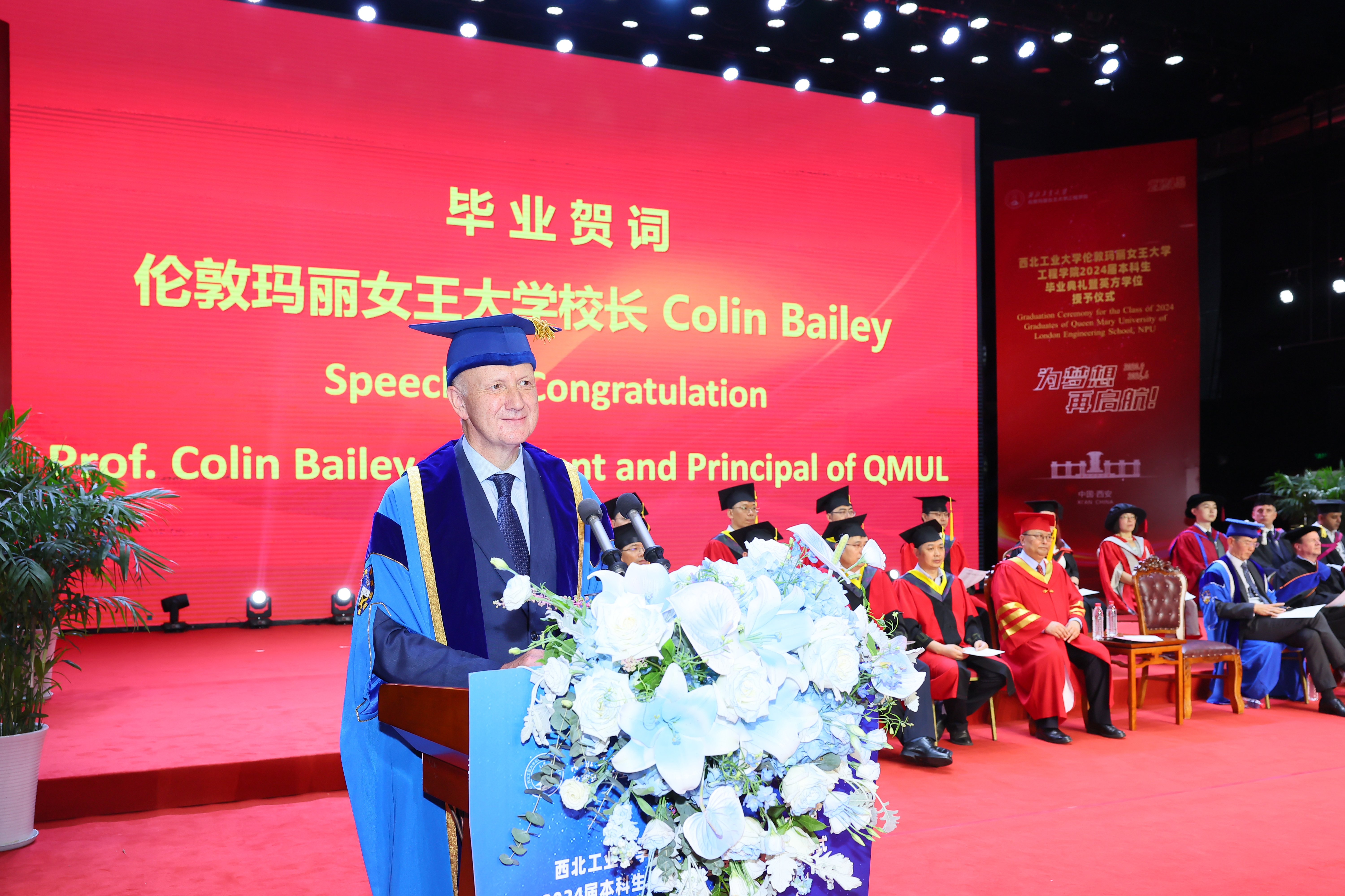 Colin Bailey 表示,非常高兴能亲临典礼现场和同学们一起庆祝圆满毕业,并向学院全体教职员工及学生亲友表示感谢。他表示,两校拥有卓越的教育与科研实力,在世界范围内广受认可,学院的毕业生拥有不可或缺的复合型能力,希望同学们紧抓时代机遇,充分运用工程理论知识和国际化理念,为全球经济社会发展做出积极贡献。